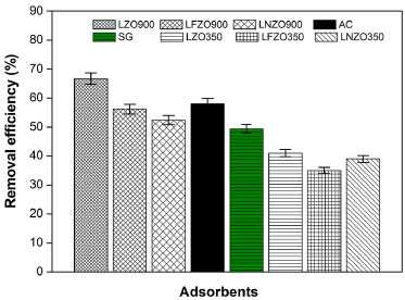![]() Figure 7. Efficiency of dye removal from industrial effluent using different materials