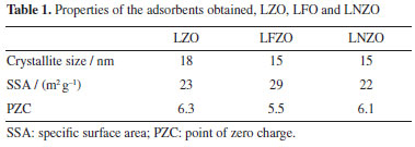Valber E. S. FirminoI; Júlia B. R. FernandesI; Marcelo J. B. SouzaII; Anne M. Garrido PedrosaI,* I. Programa de Pós-Graduação em Química, Universidade Federal de Sergipe, 49107-230 São Cristóvão - SE, Brasil Received: 04/01/2024 *e-mail: annemgp@gmail.com Mixed oxides of pyrochlore structure of the type La2Zr2O7 and La2M0.3Zr1.7O7 (M = Fe or Ni) were synthesized through the modified proteic method and calcined at 900 °C for 2 h, this is a synthesis route not yet explored for materials with this structure and were characterized by X-ray diffraction, scanning electron microscopy images, point of zero charge (PZC) and specific surface area. Its abilities to remove pollutants from aqueous media by adsorption process were investigated using a model compound. Data analysis revealed that the synthesized materials correspond to the pyrochlore phase (La2Zr2O7). They present particulate morphology with grains of different sizes and pores in their structure. The results of the adsorption studies show that the materials are efficient adsorbents for the removal of model compound in aqueous media, with efficiency above 90%. The adsorption kinetics of the compound in the adsorbents was studied. The materials were applied in reuse studies five times and maintained high efficiencies, highlighting the better performance presented by the material without doping. The obtained adsorbents were also submitted to removal of contaminants of industrial effluent tests and compared with the silica gel and activated carbon materials and also proved to be promising materials. INTRODUCTION The use of mixed oxides with perovskite or spinel structures in various processes has increased in recent years, such as in catalysis1-3 and, more recently, in the removal of contaminants from effluents by adsorption.4-7 One of the contributors to the contamination of wastewater are compounds used in the dyeing processes of fabrics, which can be generating significative amounts of these unfixed compounds, and when they are improperly discarded contribute to the negative environmental impact of water.8-10 Several materials are used as adsorbents in wastewater pollutants removal processes, especially those that stand out for their good efficiency at low cost.4,11-13 More recently, mixed oxides with a perovskite structure (with the general formula ABO3) have been shown to be efficient adsorbents in the removal of compounds used in some industrial processes, such as Congo Red, turquoise blue, methylene blue, bezaktiv red and blue.4-6,11-13 Mixed oxides of the A2B2O7 type pyrochlore structure are widely used in catalytic processes but reports of these oxides involved in adsorption processes of textile dyes were not currently found in the main search databases. In positions A and B of the pyrochlore structure, trivalent and tetravalent cations are usually found, or else A is divalent while B is pentavalent.14-16 The formation of the pyrochlore structure can be affected by combinations of cations that occupy the A and B positions, presence of dopants, synthesis methods, among other factors.15,16 The studies of obtain of materials with different combinations of cations in the pyrochlore structure, and optimized synthesis methods represent a scientific opportunity for the development and improvement of new nanomaterials with potential applications in adsorption processes, mainly with the possibility that they present advantages over the use of other conventional materials, obtaining greater efficiency in the adsorption process and possibility of reuse. Among the various methods for synthesizing mixed oxides, the modified proteic method has gained relative prominence in recent years.4-6,11-13,17,18 Considerably simple to perform compared to other methods for obtaining mixed oxides such as Pechini method, chelating precursors, mechanosynthesis or co-precipitation method, the modified proteic method ends up becoming viable due to its lower cost, lower processing temperatures, reduced steps, in addition to obtaining well-crystallized materials.4,11,17,18 In the case of the modified proteic method, the formation of the oxide typically occurs after the calcination of a complex precursor, obtained from a complexation of the chelating agent with the cations present in the solution. The chelating agent used with a high protein value is collagen, which is a relatively low-cost material and has been shown to be very effective in the formation of mixed oxides. The direct use of protein reduces reaction steps and favors the occurrence of inorganic polymer formation reactions.4,5,17,18 Recent studies4,5,18 involving synthetic nanomaterials obtained by the modified protein used as adsorbent materials have highlighted their properties such as surface area, presence of active sites that favor interaction with the dye, stability and possibility of reuse with high efficiency. The literature reports that the La2Zr2O7 material has been previously prepared by the sol-gel and Pechini methods, but there are no reports of preparation by the modified proteic method. Rao et al.19 investigated the obtaining of pyrochlore oxides of the La2Zr2O7 type by the sol-gel method as a function of temperature and concluded that nanometric and bulky particles were obtained with temperatures above 800 °C. Haynes et al.20 studied the catalytic properties of materials with a pyrochlore structure of the pure La2Zr2O7 type and with Sr and Rh doping obtained by the Pechini method for the partial oxidation reaction of n-tetradecane aiming at the production of synthesis gas, however, they were only successful in the formation of the pyrochlore phase for the strontium-doped material. Therefore, this work presents the synthesis of mixed oxides with pyrochlore structure, based on lanthanum and zirconium, with iron or nickel doping through the modified proteic method, with promising results in obtaining the desired phase and at lower synthesis temperatures. In addition, an evaluatio
