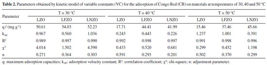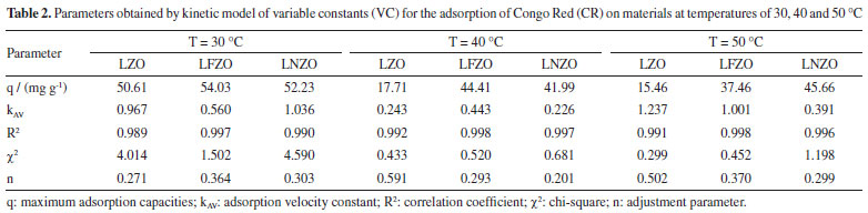 It is possible to observe that the efficiency of CR removal when temperature of system is at 30 °C occurs quickly in the first minutes of contact and remains constant, showing a subtle improvement in the adsorption at 90 and 120 min, which is an indication that there was an equilibrium in this process. By increasing the temperature to 40 °C it is possible to notice a reduction in the removal efficiency (Figure 4b). This reduction is more pronounced when LZO material was used, followed by the LNZO material. The LFZO material showed a reduction in the adsorptive capacity, but still showing a better result compared to the others. By increasing the system temperature to 50 °C, it is possible to notice that the CR removal efficiency is similar to that presented at a temperature of 40 °C and for all adsorbents. The reduction in CR removal efficiency with increasing temperature is a trend discussed in the literature. With increasing temperature, a decrease in adsorption may occur, mainly due to the weakening of the adsorption forces. The reduction in adsorption with increasing temperature can be caused due to weaker adsorption forces between the active sites of the adsorbent and the adsorbate species.28 These effects suggest that the adsorption mechanism may involve an electrostatic interaction that is generally associated with low heat of adsorption,29 that is, the adsorption process has an exothermic characteristic.30 Evaluating the results obtained from the amount of adsorbed CR compound and comparing it at the same temperature, it can be seen that the LFZO adsorbent presented the best result when the test was conducted at a temperature of 40 °C, while the LNZO material presented the best result at the temperature of 50 °C test. Similar behavior was observed to the adsorption efficiency (E, in %) in the maximum time of 120 min and at a temperature of 50 °C where LNZO showed better results followed by LFZO and LZO. At the test temperature of 30 °C, the three adsorbents showed the same adsorption efficiency, since adsorption follows a trend in which its efficiency becomes greater as there is an increase in mass transfer from the CR solution to the adsorbent material, consequently decreasing its concentration.31 The kinetic study was applied using pseudo first order (PFO), pseudo second order (PSO) and variable constant (VC) models. All applied kinetic models presented a good fit, but overall, the VC model describes the results more closely (Table 1S, Supplementary Material). The parameters obtained by VC model for the adsorption kinetics of the CR by the LZO, LFZO and LNZO materials are presented in Table 2. Due to the good fit to this model, it can be inferred that fractional reactions occur, which suggests that the concentration of the reagents changes significantly during the reaction and that the adsorption velocity constant (KAV) values are high, indicating that the reaction speeds are faster.32