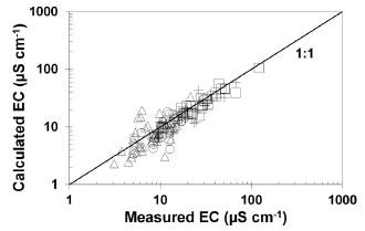![]() Figure 1. Correlation between measured and calculated electrical conductivities (EC) in BP from the four sampling sites: (□) coastal urban, (+) coastal periurban, (○) lower montane forest and (Δ) montane forest