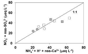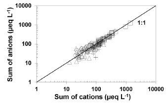 ![]() Figure 2. Correlation between the sum of cations and the sum of anions in BP from the four sampling sites: (□) coastal urban, (+) coastal periurban, (○) lower montane forest and (Δ) montane forest