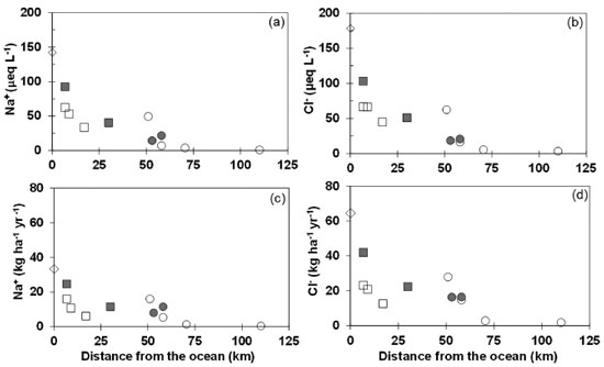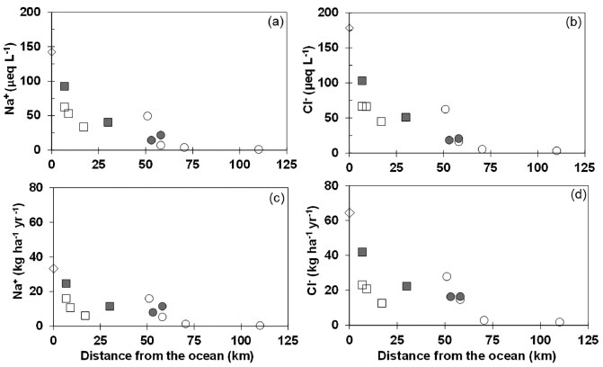 Figure 3. (a, b) Concentrations and (c, d) deposition fluxes of Na+ and Cl- in relation to distance from the ocean (all along the S-N directions) for the four sampling sites (filled symbols) and other locations (unfilled symbols) in the state of Rio de Janeiro. Filled symbols: (■) coastal urban and coastal periurban sites together and (●) lower montane forest and montane forest sites together. Unfilled symbols: (□) coastal urban,20,27 (○) montane forest39,42,43 and (◊) marine35 sites