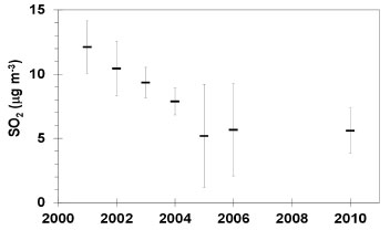 ![]() Figure 4. Annual mean concentration of SO2 calculated from data of four automated air quality monitoring stations (Centro, Tijuca, São Cristóvão and Copacabana stations) run by the Municipal Secretary of Conservation and Environment (SMAC)68 of the city of Rio de Janeiro. The vertical lines represent the standard deviations