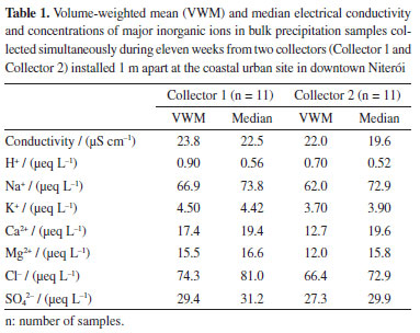 EXPERIMENTAL Study area To carry out this study, four sampling sites were selected, almost longitudinally aligned between the Atlantic coast and sections of the Serra dos Órgãos slope covered by Atlantic Forest facing the MRRJ. Two of them are located within the MRRJ, one in the urban coastal stretch west of Niterói City and the other in a periurban coastal stretch within the headquarters of Guapimirim Environmental Protection Area (APA Guapimirim). The other two are situated at lower montane (400 m altitude) forest and montane (1000 m altitude) forest areas both within a federal conservation unit, the Serra dos Órgãos National Park (PARNASO), nearby the northeastern border of the MRRJ. A map of the study area showing the locations of the four sampling sites and a very detailed description of each of them and their surroundings can be found in de Souza et al.45 They are all influenced by southeasterly winds during the day and early night (sea breeze) and northeasterly winds at dawn and in the morning (mountain breeze). During the passage of cold fronts, the winds are from the south and southwest. The dominant surface wind patterns for the study area are shown in Figure 1S (Supplementary Material) in de Souza et al.45 These areas are naturally influenced by marine aerosols and air pollution from several human activities such as fossil fuel combustion, cattle raising in the northeastern lowlands of the MRRJ, landfills, discharge of undertreated and untreated sewage into Guanabara Bay, and local and long-range transport of aerosol particles from biomass burning during the dry season. In the early 21st century, annual SO2 and NOx emissions from the MRRJ were ca. 32 Gg S and 28 Gg N, of which mobile and stationary (mainly power plants and petrochemical industries) sources represented, respectively, 12 and 88% of SO2 emissions and 66 and 34% of NOx emissions.46 The international airport and port zone of the city of Rio de Janeiro contribute with less than 1% of the total SO2 and NOx emissions.47,48 Hydrogen sulfide (H2S) emissions from polluted mangrove sediments in Guanabara Bay represent a potential local source of SO2, however, to the best of our knowledge, no H2S emission estimates from these sources have been made. Ammonia (NH3) emissions from the eutrophic surface waters of Guanabara Bay to the atmosphere were estimated to be about 1.3 Gg N yr-1.5,49 De Souza et al.45 estimated for 2008-2009 an emission of 0.31 Gg N yr-1 from livestock activities in the northeast of MRRJ. Sample collection Bulk precipitation (BP) samples were collected weekly, always on Tuesdays, from August 2008 to August 2009, as described by de Souza et al.45 These samples were collected through one bulk collector installed at all four sampling sites. The bulk collector consists of a 100 cm2 plastic high-density polyethylene funnel attached directly to a 500 mL or 1 L polyethylene bottle and fitted within PVC pipes screwed on wooden poles. A nylon net was placed inside the funnel to avoid sample contamination with branches, leaves, and insects. Before field installation, the funnels and bottles were properly washed with neutral detergent and rinsed with deionized water (< 1 µS cm-1). Then, they were dried and stored in plastic sealed bags. After sample collections, the funnels were washed with plenty of deionized water to remove plant materials and insect fragments deposited out their inner walls, and the bottles were replaced by clean ones. The field blanks (blanks samples collected in the field) were obtained from aliquots of recovered deionized water after the rinsing of all funnels in the field. A total of six field blanks were obtained during the sampling period and analyzed to check for the presence of inorganic ions. On the same day after each collection, the BP samples were transported to the laboratory and their volumes were recorded for the calculation of rainfall. All BP samples were filtered through 0.22 µm cellulose acetate membranes and immediately stored in a freezer (T = -22 °C). In unfiltered aliquots of BP samples, electrical conductivity and pH were measured with a conductivity meter (WTW model 3110 SET1) calibrated with 0.01 and 0.05 µmol L-1 KCl solutions, and a pH meter (WTW model 3210 SET2) calibrated with pH 6.86 and 4.01 standard buffer solutions.50 Chemical analysis The concentrations of cations (Na+, K+, Ca2+ and Mg2+) and anions (Cl- and SO42-) in BP samples were determined simultaneously in an ion chromatography (IC) Dionex. This equipment contains two conductivity detectors (ICS2100 for cations and ICS1100 for anions) coupled with chemical suppression systems. For determination of cations were used an IonPac GC12A guard column (4 mm × 50 mm), an IonPac CS12A analytical column (4 mm × 250 mm), a 20 mmol L-1 methanesulfonic acid eluent at a flow rate of 1.0 mL min-1 and a 50 µL injection loop. For the determination of anions were used an IonPac GC20 guard column (4 mm × 50 mm), an IonPac AS20 analytical column (4 mm × 250 mm), an eluent solution of potassium hydroxide produced by a Dionex Eluent Generator Cartridges (Dionex EGC) at a flow rate of 0.25 mL min-1 and a 50 µL injection loop. All standard solutions were prepared by the dilution of 0.01 mol L-1 stock solutions of cations and anions, from reagents of analytical grade, in deionized water (< 1 µS cm-1). The calibration curves were achieved from a set of seven standard solutions with concentrations ranging from 1.0 to 100 µmol L-1 for cations and a set of six standard solutions with concentrations ranging from 3.0 to 100 µmol L-1 for anions. All standard solutions, field blanks and BP samples were analyzed in triplicate. The limit of detection (LOD) and the limit of quantification (LOQ) were determined applying a method based on calibration curve parameters according to Miller and Miller.51 The LOD was calculated as three times the ratio between standard deviation and slope of the calibration curve, and the LOQ, as 