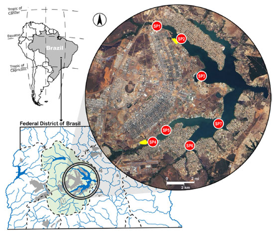 EXPERIMENTAL Study area and sampling points Located within the Brazilian Federal District (FD), Paranoá Lake is an artificial reservoir covering an area of 38 km2, with an average water volume of around 500 million m3 and depth ranging from 13 to 40 m. During the construction of the capital of Brazil, Brasília, in the 1950s, the Paranoá River was dammed, resulting in the flooding of areas below 1000 m above sea level and the creation of Paranoá Lake. This was done to ameliorate the harsh climate of the region, provide hydroelectric power, and offer recreational opportunities. Originally designed for 500,000 inhabitants, the population of Brasília now exceeds 3.0 million, putting significant pressure on local water sources.31 Presently, the hydroelectric potential of Paranoá Lake remains largely untapped, primarily serving for recreation and as the main receiver of domestic wastewater. Along its shores are embassies, sports clubs, restaurants, residential areas, and two wastewater treatment plants located in the north and south wings of Brasília’s Pilot Plan, which resembles the shape of an airplane. In addition to receiving wastewater from these treatment plants, Paranoá Lake also receives substantial amounts of rainwater runoff.31 Since October 2017, it has also served as a source of drinking water. Figure 1 illustrates the study area, the location of the sampling points selected for this study, and the WWTPs Brasília-North (BN) and Brasília-South (BS). In this lake water flows from west to east.