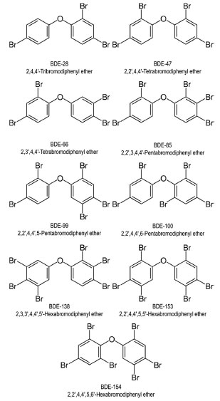![]() Figure 2. Structure, Ballsmitter-Zell (BZ) numbers, and International Union of Pure and Applied Chemistry (IUPAC) names of the nine PBDE congeners examined in Paranoá Lake sediments