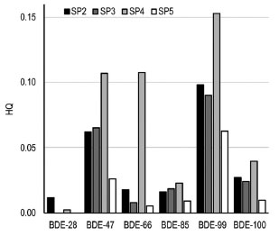 In Table 2 it is possible to observe that the corrected emissions for each congener result in a total PBDE emission of approximately 209 tons influencing sampling point SP4. The concentrations of each congener in the adjacent compartments were also estimated. Sediment levels align with those empirically obtained, suggesting that the other estimates were made in accordance with the characteristics of the investigated sampling point. In this case, presenting the results in terms of concentration is more suitable for understanding PBDE distribution, especially if such information is used to guide decision-making regarding environmental health. As an illustration, the estimated concentration of BDE-47 for soil (1.4 ng g-1) was about half of that found for sediment (2.85 ng g-1), despite the mass percentage distribution of congeners indicating soil as the predominant environment for PBDE accumulation. Clearly, the volumes and densities of each compartment used in modeling are crucial to standardizing the concentrations. Likewise, it is noteworthy that the estimated concentration of BDE-47 for biota (8.7 ng g-1 in fish) holds significance and can be used for comparison with studies dedicated to this specific part of the environment. Relatively high concentrations of all congeners are observed in aquatic suspended solids. This is a significant outcome, as these solids serve as precursors for sediment enrichment and as sources of mobility for hydrophobic substances like PBDEs in aquatic ecosystems. These values may be somehow overestimated because the parameters for the EQC standard environment used in the model may differ from the lentic lacustrine environment investigated in this study. However, given the accumulation of solids in Paranoá Lake, which may include algae from the vicinity of the WWTPs, as well as various particles from urban runoff and WWTP effluents, the estimates were deemed satisfactory. The distribution of PBDEs in the other sampling points is shown in Tables 6S to 8S of the Supplementary Material. The combined emissions from each sampling point suggest a total load of 430 tons of PBDEs entering Paranoá Lake. As limited studies have explored the presence of PBDEs in water due to their low solubility, the approach based on the use of partitioning models can be an alternative for estimating such low concentrations. For instance, the overall results indicate PBDE levels in Paranoá Lake waters ranging from 0.06 to 0.35 ng L-1. These concentrations are indeed low and may fall below the detection limits of the majority of analytical instruments available for water monitoring in Brazil, except those installed in public universities, which end up being responsible for providing the few available monitoring data, even though this is not their main responsibility. Other outcomes revealed concentrations ranging from 0.2 to 5.6 ng m-3 in air, from 0.01 to 9.6 ng m-3 in atmospheric aerosols, from 19 to 93 ng g-1 in suspended solids, from 11 to 57 ng g-1 in biota (fishes), and between 1.9 and 9.5 ng g-1 in soils. Preliminary ecological risk assessment Figure 3 presents the risk quotients calculated with PBDE concentrations estimated in the pore water. Usually, when HQ values are lower than 1, the target substance is considered to be unlikely to pose adverse effects. Conversely, if the HQ value exceeds 1, it may indicate a potential ecological risk. According to Figure 3, all HQ values are below 1, suggesting that PBDEs pose no risk to the studied environment. Nevertheless, it is noteworthy to emphasize the values exceeding 0.1 for the congeners BDE-47, -66, and -99, all calculated for the SP4 sampling point, which was identified as the most impacted in this study.