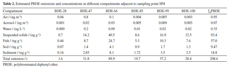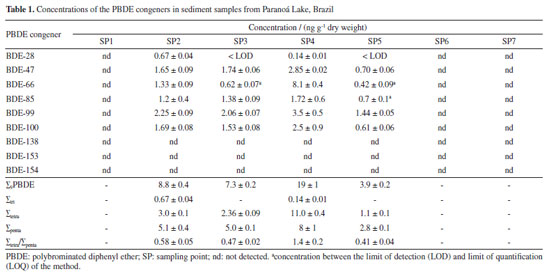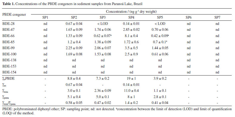 RESULTS AND DISCUSSION Distribution and sources of PBDEs in the sediments Table 1 summarizes the individual concentrations of nine PBDEs analyzed in the sediments of Paranoá Lake, along with the sums of the concentrations of the nine congeners at each sampling point (∑9PBDE), the sum of the concentrations of tri, tetra, and pentaBDE congeners (∑tri, ∑tetra, and ∑penta, respectively), and the ratio between the concentrations of tetra and pentaBDEs (∑tetra/∑penta).