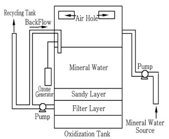 Ozone microbubbles oxidization The experiment scheme is shown in Figure 3. The microbubble generator (MF5, Shanghai Xingheng Technology, Inc., China) was placed at 0.5 m from the upper liquid side of the reaction tank (80 m3) and the ozone microbubbles generated in the generator were passed through the reaction tank. The pressure of mineral water injected into the microbubble generator was 7 atm, and ozone gas was spontaneously inhaled by the negative pressure generated inside the generator. Ozone microbubble treated mineral water was discharged through the sand filter bed and transported to the settling tank.