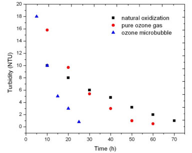 RESULTS AND DISCUSSION Effectiveness of oxidation by ozone microbubbles For mineral water with a CO2 gas content of 558 mg L-1, the changes in turbidity with time were observed for natural oxidation, pure ozone gas oxidation and ozone microbubble oxidation (Figure 4). Figure 4 shows that the turbidity of natural oxidized mineral water gradually decreases over time and takes 70 h to settle until it becomes an acceptable turbidity according to drinking water standards.