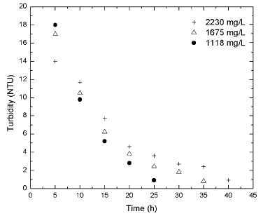 In the case of pure ozone gas oxidation, the reference turbidity was satisfied for 50 h. The settling time for oxidation by ozone microbubbles was about 25 h. The effect of oxidation by ozone gas is better compared to natural oxidation; especially the effect of ozone microbubble oxidation is three times higher. The amount of residual ozone in the solution for the oxidation by ozone gas was 1 mg L-1, and the amount of residual ozone in the oxidation by ozone microbubbles was 25.6 mg L-1, which is about 52 times higher than the solubility of ozone gas at room temperature. This means that the concentration of dissolved ozone in oxidation by ozone microbubbles is higher and the ozone availability is higher compared to oxidation by ozone gas. The internal pressure of the bubble, which has a large influence on the solubility, depends strongly on the size of the bubble. The Young-Laplace equation24 can be used to calculate the internal pressure of bubbles. ![]() where pg is the gas pressure (Pa) inside the bubble and p1 is the pressure (Pa) of the bubble outer liquid; σ is the surface tension of bubbles (N m-1), and db is the diameter of the bubble (m). According to Equation 1, the internal pressure of 1 μm bubble is 3.85 times larger compared to the internal pressure of 1 mm bubbles. Therefore, micro-bubbling of ozone gas decreases the surface area of the bubbles and increases the partial pressure of ozone gas; which increases the solubility of ozone gas.19,25 Oxidation by ozone microbubbles generates more hydroxyl radicals because of the large mass transfer coefficient of ozone gas due to the increased contact cross-section of ozone gas and water. In addition, hydroxyl radicals are generated during the cracking of microbubbles, the redox potential of hydroxyl radicals is 0.73 eV higher than that of ozone gas, which also plays a role in enhancing the additional oxidation capacity of ozone gas.24 Therefore, it can be seen that the oxidation process by ozone microbubbles increases the dissolution concentration of ozone and improves the production of hydroxyl radicals. Effect of CO2 concentration on ozone microbubble treatment Figure 5 shows the turbidity variation measured at five-hour intervals from the start of ozone microbubble treatment in mineral water with different CO2 gas concentrations. At this time, the size of ozone microbubbles is about 80 μm. When the CO2 gas content is 1118 mg L-1, the deposition time is about 25 h, about 35 h for 1675 mg L-1 and about 40 h for 2230 mg L-1. It can be seen that the deposition time increases gradually with increasing CO2 gas content.
