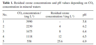 As can be seen from Figure 5, the CO2 content in the mineral water certainly affects the ozone gas bubble treatment. The lower CO2 concentration is, the more ozone gas is dissolved; thereby the oxidation of Fe2+ is accelerated and the deposition time gets short. In fact, according to Henry's solubility law, the mole fraction for water at 20 ºC and 0.1 MPa is 7.07 × 10-4 for CO2, whereas 1.885 × 10-6 for O3, CO2 is about 375 times larger than O3. Therefore, it is more difficult to dissolve ozone gas in mineral water sources with high CO2 solubility. The solubility of CO2 and O3 at the temperature of 20 ºC are 0.942 and L per L water respectively;19 the value for CO2 is about 2.4 times larger than that for O3.16,26 Gases with low values of the solubility are difficult to dissolve in water, and gases with high values of the solubility are prone to dissolve in water. Therefore, 3990 mg L-1 of CO2 gas in mineral water source would prevent additional dissolution of O3. With the removal of CO2 gas from mineral water source, the amount dissolved in water increases, resulting in a decrease in deposition time. According to experiments, it is clear that the ozone microbubble injection step should be chosen as a step with sufficient CO2-removal from mineral water. Effect of pH on ozone microbubble treatment In the case of ozone microbubble treatment, the variation of residual ozone concentration and pH with the change of CO2 gas concentration in mineral water is given in Table 1.