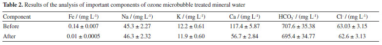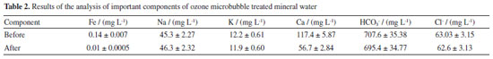 As shown in Table 1, as the content of CO2 in mineral water decreases, the pH increases and the residual ozone concentration increases. When the CO2 content in original mineral water was 3990 mg L-1, the pH was 5.8 and the residual ozone concentration was not observed, whereas the pH was 6.9 and the residual ozone concentration was 25.6 mg L-1, when the CO2 content in mineral water was 558 mg L-1. This indicates that the decrease in CO2 content of mineral water increases the solubility of ozone microbubbles, and at the same time increases the pH value of mineral water, which makes the water treatment effect by ozone microbubbles favorable.8 Decomposition reaction of ozone in water varies in characteristic depending on the pH value. Under acidic conditions of solution (pH < 7), direct oxidation reactions with molecular ozone and microorganisms dominate, and at pH ~ 7, indirect reactions with radicals that occur when ozone is dissolved in water and direct reactions occur simultaneously. In the case of pH > 7, organic compound does not react with molecular ozone, and continuous decomposition of ozone occurs with increasing pH value. In Figure 4, the good effect of ozone microbubble treatment with a concentration of 558 mg L-1 in mineral water is seen as an increase in the solubility of ozone microbubbles with a decrease in CO2 content, while the pH of mineral water is 6.9 (Table 1), which indicates that the generation of hydroxyl radicals with direct reaction of ozone molecules occurs explosively and the oxidation effect by ozone is improved. This is in good agreement with the results reported in the literature.27-30 Bityukova et al.27 reported that mineralized waters have acidic pH due to carbonatisation of the bottled waters and Kopylova et al.28 reported that the presence of CO2 accounts for the relatively low pH. Similar conclusions were made by Hoigne and Bader,29 and Mansouri et al.30 From the above experimental results and discussions, it can be seen that the ozone injection step, which is reasonable for the effect of water treatment by ozone microbubbles in mineral water with high CO2 content, is a step in which the content of CO2 is controlled so that the pH value of mineral water is about 7 or above 7. In the mineral water used in this paper, its value was 558 mg L-1. Effect of ozone microbubble treatment on ion concentration in mineral water The main components of the ozone microbubble treated mineral water with 558 mg L-1 CO2 concentration are analyzed in Table 2.