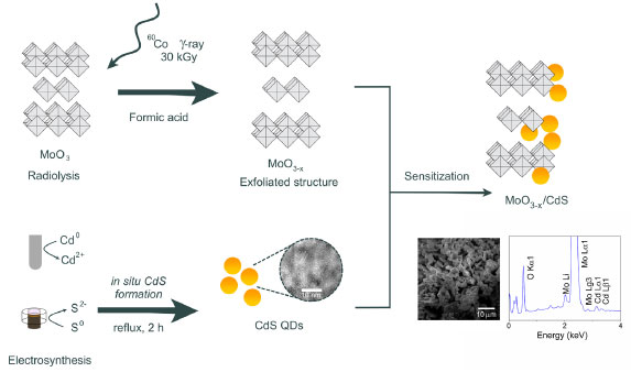 EXPERIMENTAL Materials All chemicals were of reagent grade and were used without further purification. Molybdenum trioxide (α-MoO3 ≥ 99.99%), formic acid (FA, technical grade, 85%), sodium sulphate (Na2SO4, ≥ 99.0%), Nafion® solution, elemental sulfur (S0, 100 mesh powder), graphite powder (particle size < 20 μm), 3-mercaptopropionic acid (MPA, 99%), and hydrochloric acid (37%) were purchased from Sigma-Aldrich (Saint Louis, USA). Cadmium bar (Cd, 99.9%) was purchased from Goodfellow (Coraopolis, USA). Sodium chloride (NaCl, 99%), sodium hydroxide (NaOH), ethanol (EtOH, 99.5%), lactic acid (99.0%), and isopropanol (99.5%) were purchased from Dinâmica (Indaiatuba, Brazil). Extran® MA 01, alkaline, was acquired from Merck (Rio de Janeiro, Brazil). Aqueous solutions were prepared with deionized water (17.3 Ω cm-1) (Milli-Q® EQ 7000 system, Germany). MoO3-x production The synthesis of the MoO3-x nanoparticles was carried out using gamma-ray irradiation, as described by Lima et al.23 In a typical procedure, 0.5 mmol of α-MoO3 dispersed in 5 mL of FA was placed in a sealed glass tube flask. The samples underwent irradiation within a 60Co γ-cell cobalt irradiator (Radionics Laboratory, Scotch Plains, USA) under electronic equilibrium conditions, receiving a 30 kGy dose. This procedure results in bluish-gray powder samples, characteristic of reduced molybdenum oxides. The MoO3-x were centrifuged at 6000 rpm for 15 min, followed by three washes with isopropanol. Then, the solid was dried in a woven apparatus at 60 ºC for 4 h in a nitrogen atmosphere. CdS-MPA electrosynthesis CdS-MPA QDs were synthesized using an electrochemical cavity cell (Figure 1S, presented in Supplementary Material), according to the methodology described by Costa et al.24 The cavity cell is divided into cathodic, central, and anodic compartments. The cathodic compartment, dedicated to the in situ elemental sulfur (S0) reduction to sulfide (S2-), was filled with 50 mg (4.2 mmol) of carbon powder and 1.6 mg (0.05 mmol) of sulfur and pressed under 3.2 kg cm-2, forming the macroelectrode (cathode). The cathodic compartment was separated from the central compartment using sintered glass previously sonicated with a NaCl solution (0.2 mol L-1), to decrease the liquid junction potential. The central compartment was then filled with an aqueous solution of MPA (0.3 mmol L-1) and NaCl (0.2 mol L-1). A cadmium bar was used as anode, generating Cd2+ ions through electro-oxidation. This procedure led to Cd-MPA complexes forming, followed by CdS-MPA nuclei creation in the central compartment. After electrosynthesis, the CdS-MPA quantum dots nuclei were heated under reflux for 2 h to promote particle growth. Embedding of CdS-MPA QDs on MoO3-x The process followed the procedure reported in previous works.24 CdS-MPA QDs were embedded on the MoO3-x surface by mixing 100 mg of MoO3-x with 5 mL of the CdS-MPA colloidal solution, under stirring for 30 min. Quick adsorption of the QDs on the MoO3-x surface was observed, where the supernatant becomes clear without the presence of quantum dots. The MoO3-x/CdS heterostructure was centrifuged, and the supernatant was removed. The solid (dark gray color) was washed three times with ultra-pure water. Then, another 5 mL of QDs were added to the composite, which was kept under stirring for 30 min. The final composite was isolated as previously described, washed three times with ultra-pure water and acetone, and dried under a high vacuum for 1 h. The entire synthetic process is depicted in Figure 1.