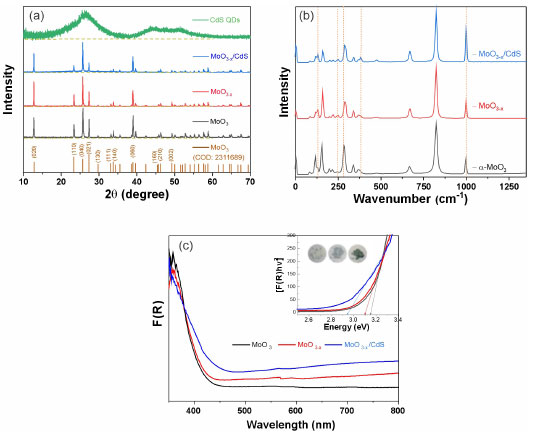 ![]() Figure 2. Structural and interface characterization for MoO3, MoO3-x, and MoO3-x/CdS: (a) powder X-ray diffraction ( XRD) patterns, (b) Raman spectra, and (c) diffuse reflectance spectra (inset: samples and Tauc plot)