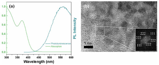 ![]() Figure 3. Optical and morphological characterization of CdS-MPA QDs: (a) photoluminescence and absorption spectra and (b) high-resolution transmission electron microscope (HRTEM) image (inset: FFT pattern of CdS QDs)