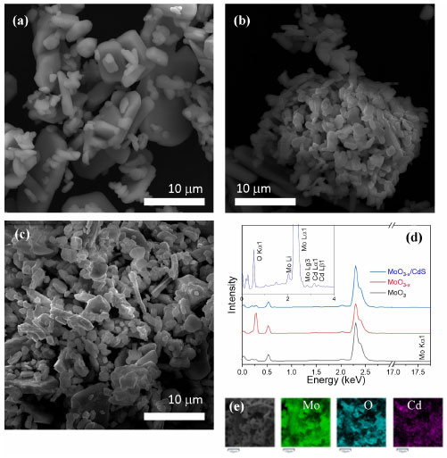 ![]() Figure 4. Scanning electron microscope ( SEM) images of (a) MoO3, (b) MoO3-x, (c) MoO3-x/CdS-MPA QDs, (d) energy dispersive X-ray (EDX) spectra of all samples. The inset offers the EDX of the MoO3-x/CdS heterojunction. (e) Elemental mapping of Mo, O, and Cd of MoO3-x/CdS-heterojunction