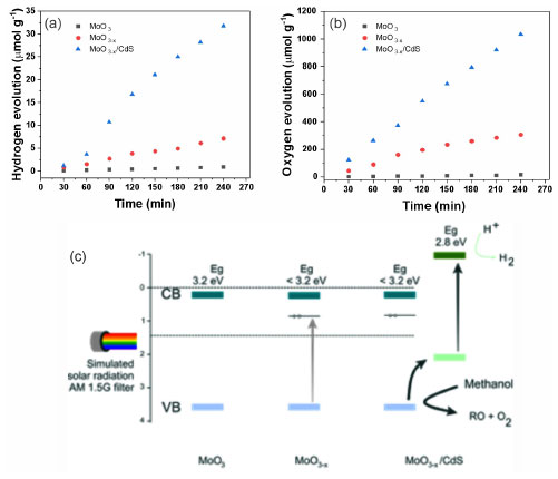 Structural and interfaces evolution Photoelectrochemical strategies such as chronoamperometry verified the performance gains associated with improved charge transfer at semiconductor interfaces. The experiments were carried out with simulated sunlight (Xe lamp, 150 W, filter AM 1.5 G) (Figure 7S, Supplementary Material). The photocurrent density increased from 0.12 μA cm-2 for MoO3 to 0.63 μA cm-2 with the substoichiometric oxides (MoO3-x). With the formation of the MoO3-x/CdS heterojunction, a photocurrent density of up to 1.22 μA cm-2 was obtained. The formation of oxygen vacancies in the MoO3 structure allows two processes: the increase in the absorption region of solar radiation and the improvement in electrical conductivity, increasing photoresponse. Nevertheless, despite the progress in radiation absorption within the visible region, a challenge remains with the relative positioning of bands, specifically concerning the MoO3 conduction band (CB: 0.29 V) concerning the hydrogen reduction line (H + |H2: 0.00 V), where the process lacks thermodynamic spontaneity. The results of water splitting in the presence of methanol (10%) with apparent pH 6.0, under simulated sunlight irradiation (100 mW cm-2) and controlled temperature at 25 ºC, showed the formation of small amounts of H2 for the MoO3 and MoO3-x systems, a consequence of the positioning of the MoO3 conduction band and hydrogen reduction line (Figure 5a). The synthesis of MoO3-x/CdS-MPA QDs produced 35 μmol of H2 upon irradiation, indicating a 4.2× increase compared to the reduced oxide. However, for the oxygen generation profile, it appears that the MoO3-x system produced 300 μmol O2 and the MoO3-x/CdS close to 1100 μmol of O2 (Figure 5b) after 240 min of experiment.