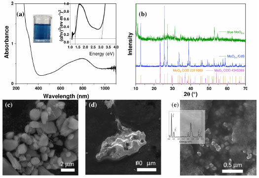 ![]() Figure 6. Characterization of photocatalysts post-catalysis: (a) colloidal solution formed using MoO3-x powder with an inset showing the extrapolation of the Tauc curve and a 30 × diluted sample. (b) Powder X-ray diffraction ( XRD) of colloidal MoO3-x and MoO3-x/CdS-MPA QDs. Scanning electron microscope (SEM) images for the catalysts: (c) MoO3 (d) MoO3-x and (e) MoO3-x/CdS-MPA QDs, inset: energy dispersive X-ray (EDX) spectrum