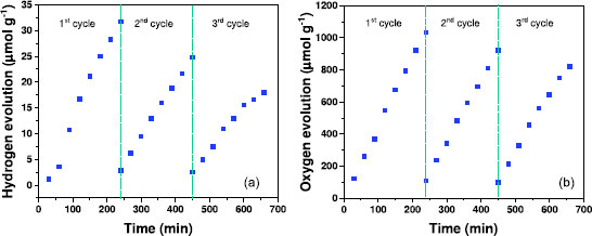 ![]() Figure 7. Cycles of hydrogen (a) and oxygen (b) production in the presence of the MoO3-x/CdS photo-catalyst using 10% methanol as a hole scavenger