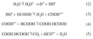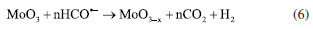 RESULTS AND DISCUSSION The formation of molybdenum suboxides involves mechanisms of exfoliation of the structure and partial reduction of the structure through the formation of oxygen vacancies and reduction of the metal ion,26 where microstructural advances and changes in the intra-gap levels of the MoO3-x were investigated by different techniques. Structural and interfaces evolution The interaction between γ-radiation and FA promoted the formation of radicals capable of in situ reducing or oxidizing species. The presence of a small amount of water in the FA present in the solution allows the formation of potentially reducing species such as H• and HO• (Equation 2). These are important for forming reducing species from the FA molecule. The possible means of interaction begins with the formation of radical anions COOH- through interaction with HO•– (Equation 3).27,28 Such a process is followed by interaction with new FA molecules (Equation 4), and, in a final radiolysis stage, the formation of CO2 and HCO•– (Equation 5) occurs.29 HCO•– anions act as the final reducing agent in the MoO3 structure. ![]() The reduced oxide production via radiolysis depends on the concentration of water, which is crucial for the progression of the reaction. The formation of the reduced oxide can be expressed by Equation 6. After radiolysis, upon opening the septum of the reaction vessel, the presence of pressurized gas was confirmed and identified as CO2 using gas chromatography, verifying the proposed reaction mechanism. ![]() In this way, two characteristics are measurable: the first is associated with electronic effects by the formation of oxygen vacancies () and reduction of Mo6+ to Mo4+, and the second is related to the exfoliation of the material, increasing the interplanar distance in preferred crystallographic directions.26,30 Different techniques were used to monitor the structural and electronic changes after the radiolysis step, for the formation of the reduced oxide MoO3-x, and after the formation of the heterojunction between MoO3-x and CdS-MPA QDs. The results are shown in Figure 2.