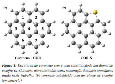 METODOLOGIA Como ponto de partida, as coordenadas atômicas de uma unidade de coroneno foram construídas partindo de coordenadas cartesianas encontradas na literatura e pacotes gráficos. Para avaliar as mudanças nas propriedades eletrônicas, estruturais do coroneno, devido à presença de um heteroátomo enxofre, denominado neste trabalho de COR - S, foi construído substituindo um dos átomos de carbono da borda por um átomo de enxofre, transformando um anel de seis para um de cinco membros, devido ao enxofre ser preferivelmente divalente. Estas duas estruturas estão mostradas na Figura 1, com a numeração dos anéis aromáticos usadas neste trabalho.