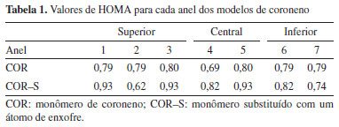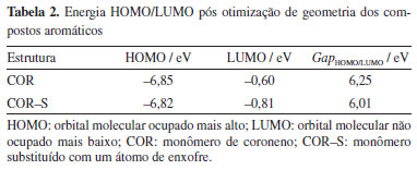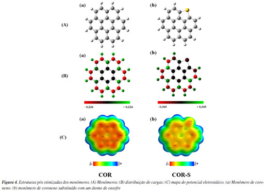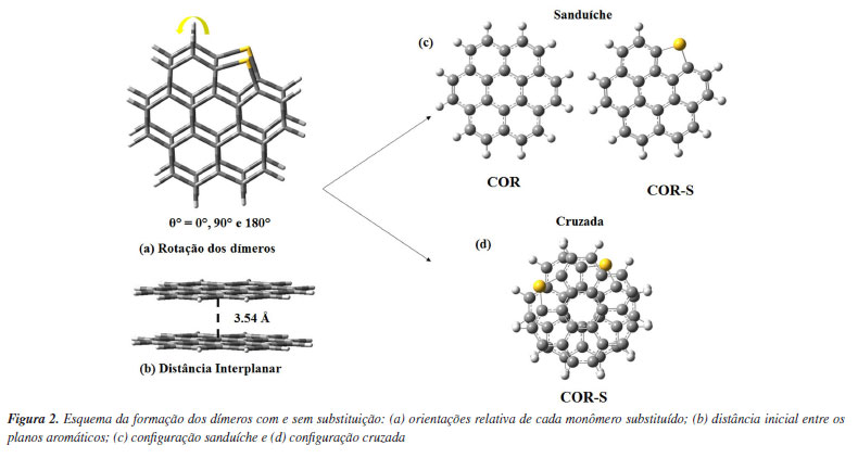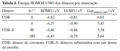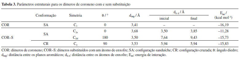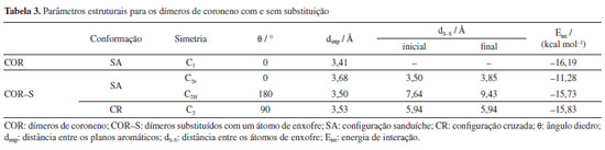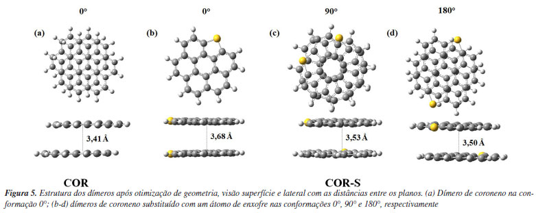 Na Tabela 3 podemos observar a análise conformacional dos dímeros de coroneno (COR) e de coroneno substituído pelo átomo de enxofre (COR - S), onde no dímero de COR (Figura 5a) o resultado encontrado ( - 16,19 kcal mol - 1) está em bom acordo com valor obtido para a energia de interação entre monômeros de coroneno calculados com método CCSD(T)/aug-cc-pVDZ.52 Assim como a distância interplanar encontrada, após otimização, foi de 3,41 Å, valor em bom acordo com resultado experimental de 3,46 Å.54