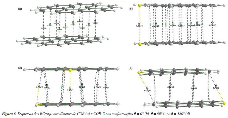Essa interação pode ter sido facilitada pelo deslocamento dos planos aromáticos, onde tal resultado pode ser atribuído à diminuição da energia de repulsão, consequência do aumento das distâncias H - H interatômicas entre os monômeros. Como a densidade eletrônica nas moléculas aromáticas possui máximos diretamente acima dos elétrons π, o efeito de repulsão entre eles é o fator que impede o encaixe paralelo, por este motivo, o arranjo deslocado lateralmente é o mais estável, sendo este comportamento também observado entre folhas de grafeno e grafite.27,52 Na análise conformacional dos dímeros de COR - S, o cálculo das energias de interação no dímero mostra que a substituição e a posição do heteroátomo influenciam diretamente no valor da energia encontrada. Entretanto, as estruturas S-substituídas apresentaram menor interação entre os planos aromáticos independente da conformação quando comparados ao dímero de COR. Este comportamento foi observado por Castellano et al.27 ao estudarem dímeros de benzeno, piridina e tiofeno em diferentes posições com o método DFT/GGA PW91 e o conjunto base DNP, onde o dímero de benzeno apresentou melhor interação na conformação paralela, pois privilegiava a interação π-π. Entretanto, no caso dos dímeros de tiofeno, essa interação não era favorecida por ser fortemente repulsiva, pois, para este dímero, a conformação ideal seria a em forma de T, já que privilegiaria a interação σ-π.27 Contudo, a conformação em T não é adequada para o estudo da agregação asfaltênica que privilegia as interações π-π, por conta do efeito estérico causado pelas cadeias laterais destas estruturas e as dificuldades para se estabilizar esta estrutura asfaltênica em fase condensada.24,26,32 Em outro trabalho, Sodero et al.29 estudaram por meio da dinâmica molecular, com o campo de força GROMOS96, quatro modelos diferentes de asfaltenos de modo a avaliar a influência da posição do átomo de enxofre na parte aromática e lateral destas estruturas. Eles concluíram que a posição do átomo de enxofre tem um efeito nas interações intermoleculares não covalentes, existentes nesses sistemas, mesmo que a cadeia lateral seja importante para determinar a agregação, as principais interações entre as moléculas são produzidas pelos núcleos aromáticos, que orientam de forma paralela as moléculas. Além disso, eles concluíram que um átomo de enxofre no anel aromático não impede a agregação, o que está de acordo com os presentes resultados obtidos com um método DFT. Nas estruturas COR - S, a conformação θ = 0º (Figura 5b) apresentou a menor interação ( - 11,28 kcal mol - 1) dentre todas as estruturas, provavelmente por conta da repulsão entre os planos aromáticos, que não deslocaram, deixando os átomos de enxofre bem próximos. A conformação θ = 90º (Figura 5c) apresentou a maior estabilidade e a maior interação entre os monômeros ( - 15,83 kcal mol - 1), com uma variação mínima da distância entre os planos e uma distância intermediária entre os átomos de enxofre. Na conformação θ = 180º (Figura 5d), os planos aromáticos se deslocam e a distância entre eles é a menor dentre as estruturas S-substituídas, entretanto, apresentou uma interação intermediária ( - 15,73 kcal mol - 1). Os parâmetros topológicos densidade eletrônica (ρ) e o Laplaciano (∇2ρ) são ferramentas bem definidas da QTAIM para avaliar a interação de dois quaisquer átomos num sistema molecular.49,92 O chamado ponto crítico de ligação (BCP) representa um ponto de sela da densidade eletrônica entre dois átomos formando uma ligação química, ou no nosso caso, indicando também uma interação entre dois pontos específicos. Ligações covalentes são representadas por linhas sólidas e não covalentes por linhas pontilhadas. Conforme os resultados apresentados na Figura 6, as linhas entre os dímeros são pontilhadas, indicativo de interações não covalentes, o que é corroborado pelos BCPs que apresentaram valores de ρ e ∇2ρ dentro da faixa de valores esperado as interações de van der Waals (~10 - 3 u.a. e positivas, respectivamente).93 As propriedades dos pontos críticos das estruturas estão disponíveis no material suplementar nas Tabelas 6S a 9S.