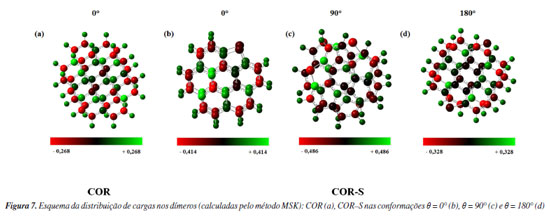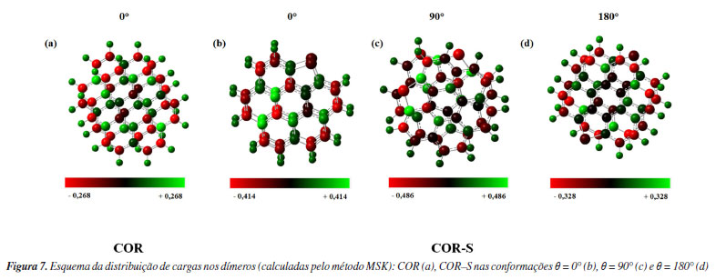 Além disso, a análise mostra que existem três tipos diferentes de interação nas estruturas dos dímeros: C...C, C...S e S...S. Dentre elas a estabilidade relativa das estruturas diméricas indica que as ligações C...C (BCP: ρ = 0,0059 e ∇2ρ = +0,15786 u.a. são as ligações mais fortes no dímero de COR (Figura 6a) quando comparado aos dímero de COR - S, onde o maior valor para BCP C...C está na conformação θ = 180º (Figura 6d) (BCP: ρ = 0,0056 e ∇2ρ = +0,01478 u.a.). Este resultado pode estar atrelado a magnitude da interação, visto que o dímero do COR possuiu maior interação do que as estruturas COR - S, corroborando para a ideia de que a agregação é um efeito causado pela interação entre os planos aromáticos, a π-π stacking. Entretanto cabe ressaltar que, nos dímeros COR - S, os átomos de enxofre formam pontos críticos de ligação com valores maiores do que os encontrados no restante da estrutura. Além disso, quanto mais afastado os átomos de enxofre estão, menor é a magnitude da ligação as quais eles participam. Na conformação θ = 0º (Figura 6b), o BCP S...S é igual a ρ = 0,0053 e ∇2ρ = + 0,01674 u.a. e a maior dentro dessa conformação, podendo ser um indicativo de que a repulsão entre os átomos de enxofre causa uma diminuição na interação entre os átomos. Na conformação θ = 90º (Figura 6c), a de maior interação, são formados dois pontos críticos entre os átomos de enxofre e os átomos de carbono BCP C...S e são iguais a ρ = 0,0063 e ∇2ρ = + 0,01903 u.a. Na conformação θ = 180º (Figura 6d), são formados dois pontos críticos entre os átomos de enxofre e os átomos de carbono BCP C...S sendo iguais a ρ = 0,0050 e ∇2ρ = +0,01512 u.a., a menor magnitude encontrada quando comparada as outras três conformações. A análise da distribuição de cargas, nos dímeros do COR e do COR - S (Figura 7), mostrou que o dímero que mais agregou (dímero COR) apresenta a região intermediária com carga parcial mais positiva e que ocorreu um aumento na magnitude das cargas quando comparado aos monômeros, reforçando a ideia de que os heteroátomos podem influenciar a agregação por meio de uma interação eletrostática. No dímero do coroneno (Figura 7a), a magnitude das cargas é maior (+0,268 ē) e mais positiva do que no monômero isolado (+0,042 ē). A região da borda fica mais negativa ( - 2,667 ē), a região intermediária mais positiva (+0,963 ē) e a região central levemente negativa ( - 0,029 ē).