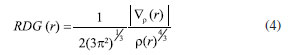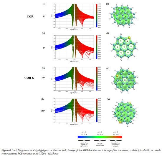 Para uma melhor identificação das características das interações entre os monômeros sem ou com substituição em seus dímeros, o método NCI (interações não covalentes) foi utilizado50 e expressa através dos gráficos em 2D do gradiente de densidade reduzida (RDG) (Figuras 8a-8d) e 3D (Figuras 8e-8h). Nos gráficos 2D de s versus ρ (Figuras 8a-8d), as NCIs são refletidas pelos picos característicos que aparecem em baixa densidade eletrônica por causa da perda do gradiente de densidade nesses pontos. As interaçoes são diferenciadas pela cor das isosuperfícies, onde a cor azul representa as interações atrativa, a cor verde as interações fracas de van der Waals e a cor vermelha as interações repulsivas.