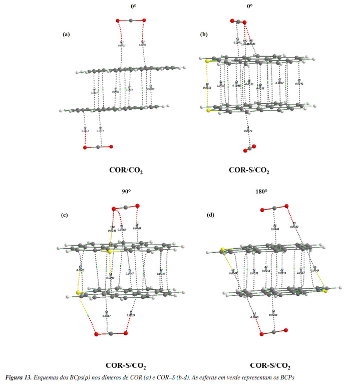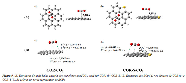 Os resultados mostram que a presença um pico verde na região s(signλ2)ρ) de baixa densidade, indica que as interações entre os monômeros, dentro de cada dímero, são do tipo van der Waals em todas as estruturas, como era esperado devido as interações de empilhamento π-π.77 De acordo com o gráfico 3D (Figura 8e), é possível observar a diferença na distribuição da densidade por causa da mudança da conformação, onde grande "região esférica" verde entre os planos aromáticos, indica que o fator essencial para a agregação dos asfaltenos são as interações de van der Waals, que abragem toda a estrutura e decorrem da interação entre os anéis aromáticos (a interação π-π) e está bem definida, no dímero de COR.31,77 A presença de um pico vermelho na região s(signλ2)ρ) de densidade 0,002 u.a. indica uma repulsão estérica causada pela proximidade entre os monômeros no dímero. No COR (Figura 8a), este pico é contínuo, diferente dos picos encontrados nas conformações do COR - S. Esta intensidade pode estar relacionada à distância (3,41 Å) entre os monômeros nesse dímero, que é a menor encontrada dentres todas as estrututuras diméricas. No gráfico 2D dos dímeros de COR - S (Figuras 8b-8d) é possível observar a presença de um pico vermelho na região s(signλ2)ρ) de densidade 0,004 u.a. causado pela presença do heteroátomo na estrutura. Na conformação θ = 0º (Figura 8b), esse pico é mais intenso do que nas outras conformações substituídas. O efeito dessa proximidade entre os átomo de enxofre causa uma falha na grande "região esférica" verde entre os planos aromáticos vista na Figura 8e, característicos de gráficos que mostram o anel central do coroneno, como já mencionado84-88 Este resultado mostra que o átomo de enxofre interfere na interação de van der Waals e, provavelmente por este motivo, os dímeros COR - S apresentaram menor interação do que o dímero de COR. Na conformação θ = 90º (Figura 8c), a de maior interação, o pico intenso na região de baixa densidade (cor verde), indica que as interações predominantemente são do tipo van der Waals. Na região do efeito estérico, como os átomos de enxofre estão mais distantes do que na conformação θ = 0º, o pico vermelho aparece depois região s(signλ2)ρ) de densidade 0,004 u.a., e, embora presente, é menos intenso. No gráfico 3D (Figura 8g), a grande "região esférica" verde entre os planos aromáticos apresenta uma "falha", com aspecto de um buraco na densidade eletrônica, no mapeamento da densidade eletrônica dos anéis aromáticos. Este buraco é observado somente na região do anel central, referente a estrutura que não apresentou um deslocamento relativo dos planos dos anéis aromáticos. Logo, a simetria da estrutura permite que a sobreposição das nuvens eletrônicas mantenha essa região de densidade tendendo a zero de cada coroneno frente a frente, gerando assim o buraco no mapa do gradiente da densidade eletrônica. Na conformação θ = 180º (Figura 8d), o pico intenso na região de baixa densidade (cor verde) indica que as interações predominantemente são do tipo van der Waals. Na região do efeito estérico, como os átomos de enxofre estão mais distantes ainda, o pico vermelho aparece depois da região s(signλ2)ρ) de densidade 0,004 u.a., e, embora presente, é o menos intenso quando comparado as outras conformações substituídas. No gráfico 3D (Figura 8h), a grande "região esférica" verde entre os planos aromáticos não apresenta "falhas" no mapeamento da densidade dos anéis aromáticos, muito parecido com o gráfíco do COR. Isso pode estar relacionado ao deslocamento entre os planos aromáticos, e a distância entre os átomos de enxofre, diminuindo o efeito de repulsão entre os monômeros, sendo assim as nuvens eletrônicas interagem e a região central, de densidade eletrônica quase nula, desaparece. Diante das análises aqui realizadas podemos concluir que a adição do heteroátomo de enxofre não favorece a interação entre os planos aromáticos quando comparado ao dímero sem substituição, entretanto se torna ainda mais importante entender se o heteroátomo afeta a adsorção de CO2. Influência do CO2 na dimerização do coroneno Interação com monômeros Nesta etapa do trabalho, uma única molécula de CO2 foi aproximada dos monômeros de COR e COR - S (previamente otimizados) (Figura 9A), e os resultados de otimização de geometria indicam que a molécula CO2 adsorve preferencialmente sobre a superfície aromática via interações fracas não ligadas, sem a participação direta do enxofre. Este resultado fica mais evidente na análise QTAIM (Figura 9B) que foi utilizada para caracterizar os BCP entre as moléculas de CO2 e os monômeros estudados. Os BCPs presentes nos sistemas COR/CO2 e COR - S/CO2 possuem valores de densidade eletrônica na faixa proposta pela literatura93 que caracterizam interações fracas (~10 - 3 u.a. e positivas, respectivamente), sendo possível observar que a magnitude da interação é bem semelhante em ambas as estruturas. Logo, a primeira vista, a funcionalização do coroneno não altera apreciavelmente sua interação com CO2, entretanto, a análise QTAIM mostra que a interação MON/CO2 é levemente maior no monômero COR - S.