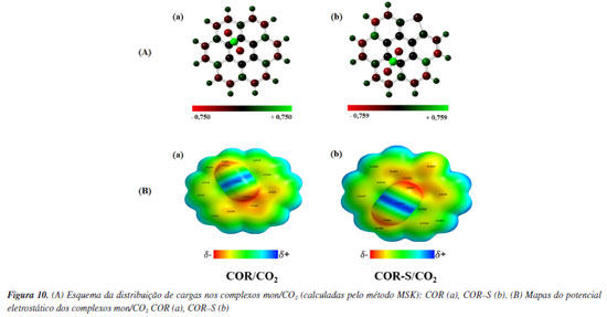 No monômero COR (Figura 9Aa), a posição preferencial do CO2, dentre todos os sítios testados, é sobre um par de átomos de carbono diretamente ligados, posicionados na região central do monômero, mantendo os átomos de oxigênio posicionados no centro de anéis aromáticos vizinhos. A distância entre o CO2 e o plano aromático, após otimização, para esta configuração é 3,18 Å e a energia de interação é de - 3,33 kcal mol - 1 próximas aos valores encontrados na literatura.45,95 As energias dos demais complexos COR/CO2 e suas figuras estão disponíveis no material suplementar na Tabela 10S e Figura 3S, respectivamente. A análise QTAIM no complexo COR/CO2 (Figura 9Ba) mostra que existem dois tipos diferentes de interação entre o CO2 e o monômero: O...C e C...C. A estabilidade relativa dos complexos indica que as ligações C...C (BCP: ρ = 0,0067 e ∇2ρ = +0,0256 u.a. são ligações menos fortes quando comparado as ligações C...C no complexo COR - S/CO2. As ligações O...C possuem BCP: ρ = 0,0041 e ∇2ρ = +0,0145 u.a. As propriedades dos pontos críticos das estruturas estão disponíveis no material suplementar na Tabela 15S. No monômero COR - S (Figura 9Ab), a posição preferencial para o CO2 é ligada diretamente em átomos de carbono posicionados na região central da estrutura, assim como no coroneno. A distância entre o CO2 e o plano aromático para este arranjo é 3,18 Å, e a energia de adsorção do CO2 é - 3,33 kcal mol - 1, a mesma encontrada no complexo COR/CO2. Este resultado pode estar atrelado ao fato da molécula de CO2 não interagir diretamente com o heteroátomo, preferindo aos anéis aromáticos opostos à substituição. A análise QTAIM no complexo COR/CO2 (Figura 9Bb), mostra que, assim como no complexo COR/CO2, existem dois tipos diferentes de interação entre o CO2 e o monômero: a interação O...C com BCP: ρ = 0,0040 e ∇2ρ = +0,0139 u.a., e a interação C...C BCP: ρ = 0,0068 e ∇2ρ = +0,0257 u.a. A análise das cargas atômicas obtidas com o método de Merz-Kollman mostra que a adição da molécula de CO2 promove uma redistribuição nas cargas atômicas nos monômeros COR e COR - S (Figura 10A) e na própria molécula, o que já era esperado, pois a presença do CO2 na proximidade do anel gera polarização da estruturas eletrônica dos anéis aromáticos impactando no potencial eletrostático do sistema.