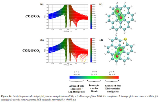 A redistribuição das cargas atômicas (Figura 10Aa) sobre os átomos de carbono localizados na borda do coroneno fornece um somatório de cargas mais negativo nessa região devido a presença do CO2 (de - 2,536 ē para - 2,630 ē), na região intermediária, esse somatório fica significativamente mais positivo (de +0,348 ē para +0,828 ē) e a região do centro da estrutura do coroneno torna-se suavemente negativa (saindo de +0,014 ē para - 0,016 ē). Após adsorver no coroneno, o CO2 apresenta um pequeno aumento em sua carga parcial (carga total = - 0,005 ē). A redistribuição das cargas atômicas (Figura 10Ab) sobre os átomos de carbono na estrutura substituída também sofre alterações. A região da borda do COR - S fornece um somatório de cargas mais negativo nessa região com a presença do CO2 (de - 2,525 ē para - 2,564 ē), na região intermediária, esse somatório fica um pouco mais positivo (de +0,904 ē para +0,974 ē) e possui a maior variação (cerca de 0,070 ē), e a região do centro da estrutura fica mais negativo (saindo de - 0,028 ē para - 0,085 ē). Após a adsorção do CO2 no monômero de COR - S é verificado um aumento um pouco mais expressivo na magnitude da carga do CO2 em relação ao visto no complexo do COR (qCO2 = - 0,013 ē), ainda que a influência dele na estrutura seja menor do que a observada no COR. A adsorção do CO2 promove uma mudança na carga do enxofre que se torna mais negativa (de - 0,085 ē a - 0,105 ē), mesmo não estando próximo a ele. Os valores de todas as cargas encontradas estão diponíveis no material suplementar nas Tabelas 12S e 13S. Na análise da densidade eletrônica observada pelo mapa de potencial eletrostático (Figura 10B), é possível notar que a adsorção da molécula de CO2 sobre a estrutura de COR (Figura 10Ba) modifica a distribuição de carga, redistribuindo a carga na estrutura, ocorrendo uma diminuição na densidade do monômero visto que, regiões antes vermelhas, agora estão amarelas, apontando menor densidade eletrônica. Entretanto, as áreas deficientes em elétrons (cor azul) diminuem consideravelmente quando comparadas ao mapa sem CO2. Cabe ressaltar que o maior potencial dos átomos de oxigênio na molécula de CO2 está no oxigênio oposto ao que interage com o átomo de carbono da estrutura como visto na análise QTAIM (Figura 9Ba). No complexo COR - S/CO2 (Figura 10Bb) ocorre uma mudança na distribuição eletrônica menos significativa na estrutura como um todo, pois somente é observado uma variação onde está adsorvida a molécula de CO2. A área que antes possuía uma concentração de elétrons, cor vermelha, agora está amarela. Entretanto, assim como no complexo COR/CO2, o maior potencial dos átomos de oxigênio na molécula de CO2 está no oxigênio oposto ao que interage com o átomo de carbono da estrutura como visto na análise QTAIM (Figura 9Bb), e neste caso influenciando na diminuição do potencial do átomo de enxofre ( - 0,0197 para - 0,0281 u.a.). O caráter não covalente da interação entre a molécula de CO2 e os monômeros, já vista pela análise QTAIM, foi confirmado também pela análise NCI.50 Esta análise está expressa por meio dos gráficos em 2D do gradiente de densidade reduzida (RDG) (Figuras 11a e 11b) e 3D (Figuras 11c e 11d).