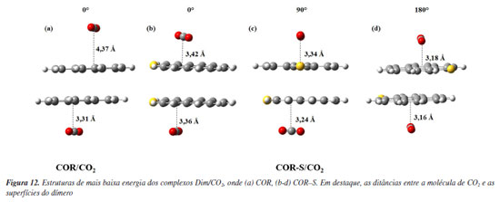 Na Figura 11, a presença de um segundo pico verde na região de baixa densidade indica que as interações entre as estruturas e o CO2 são do tipo van der Waals, corroborada pela presença da região verde presente entre a molécula e o monômero conforme os gráficos em 3D (Figuras 11c e 11d). Os picos de cor vermelha na região s(signλ2)ρ) de densidade 0,004 u.a. (Figura 11d) são referentes ao efeito de repulsão estérica causado pelo átomo de enxofre, que não interage com o CO2 (círculo laranja). Interação do CO2 com os dímeros de COR e COR - S Nesta etapa do trabalho, uma única molécula de CO2 foi aproximada em cada superfície dos dímeros de COR e COR - S (previamente otimizados e mantidos fixos) (Figura 12), de modo a avaliar a influência do gás em um aglomerado. Os resultados de otimização de geometria indicam que, assim como no monômero isolado, a molécula CO2 adsorve preferencialmente sobre a superfície aromática, em ambos os lados, via interações fracas não ligadas, a príncipio sem interação direta do enxofre e dependente da conformação do dímero e da funcionalização. Pelas distâncias CO2-Dim (CO2-dímero) expostas na Figura 12, é possivel observar que a molécula de CO2 tem mais afinidade com os dímeros substituídos, do que com o dímero de COR.