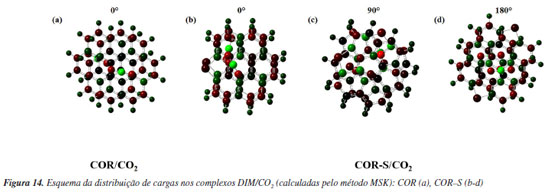 A partir dos valores de densidade eletrônica, é possível observar que a magnitude da interação C...C entre o átomo de carbono do CO2 e o átomo de carbono dos monômeros nos dímeros é maior na interação da molécula com os dímeros substituídos do que no dímero sem substituição, logo, a funcionalização do coroneno altera apreciavelmente sua interação com CO2, quando as estruturas estão agregadas. A análise QTAIM no complexo COR/CO2 (Figura 13a) mostra que existem três tipos diferentes de interação entre o CO2 e o dímero COR. No monômero superior, a molécula interage pelos átomos de oxigênio formando dois pontos críticos, o O...C com BCP: ρ = 0,0007 e ∇2ρ = +0,0030 e o O...C com BCP: ρ = 0,0008 e ∇2ρ = +0,0033. Nota - se que a magnitude da interação CO2/mon é a menor de todas as conformações e pode estar associado a distância entre a molécula e o CO2 que é a maior encontrada dentre monômeros e dímeros (d = 4,37 Å). No monômero inferior, como a molécula de CO2 está mais próxima, ela forma dois pontos críticos, de maior magnitude, sendo um O...C com BCP: ρ = 0,0053 u.a. e ∇2ρ = +0,0169 u.a. e um C...C com BCP: ρ = 0,0053 u.a. e ∇2ρ = +0,0184 u.a. No complexo COR - S/CO2 (Figuras 13b-13d), a molécula de CO2 também interagiu diferentemente com as superfícies do dímero. Na conformação θ = 0º (Figura 13b), no monômero superior, a molécula interage pelos átomos de carbono formando um ponto crítico C...C BCP: ρ = 0,0070 u.a. e ∇2ρ = +0,0264 u.a. No monômero inferior, como a molécula de CO2 está mais próxima, ela forma três interações, sendo uma C...C BCP: ρ = 0,0071 u.a. e ∇2ρ = +0,0260 u.a. e duas interações O...C BCP: ρ = 0,0048 u.a. e ∇2ρ = + 0,0166 u.a. Na conformação θ = 90º (Figura 13c), que é o dímero de maior agregação, apresentou um novo tipo de interação, onde neste caso envolve diretamente o átomo de enxofre, o que não foi percebido somente pela avaliação da energia de interação e nem na interação da molécula de CO2 com o monômero isolado, pois essa interação surge na interação da molécula com o dímero. No monômero inferior a molécula de CO2 interage por meio de três diferentes tipos de interação: a primeira entre o O...S BCP: ρ = 0,0050 u.a. e ∇2ρ = +0,0200 u.a., a segunda entre C...C BCP: ρ = 0,0067 u.a. e ∇2ρ = +0,0252 u.a. e a terceira entre O...C BCP: ρ = 0,0059 u.a. e ∇2ρ = +0,0208 u.a. No monômero superior a molécula de CO2 interage por meio de duas interações, entretanto um mesmo átomo de oxigênio forma duas interações distintas, sendo a primeira O...S BCP: ρ = 0,0046 u.a. e ∇2ρ = +0,0193 u.a. e a segunda O...C BCP: ρ = 0,0068 u.a. e ∇2ρ = +0,0248 u.a. O outro átomo de oxigênio forma uma interação O...C BCP: ρ = 0,0065 u.a. e ∇2ρ = +0,0216 u.a. Na conformação θ = 180º (Figura 13d), a interação entre as moléculas de CO2 e os monômeros é a mesma, visto que elas possuem a distância CO2/mon bem semelhante, onde a molécula de CO2 e o monômero interagem formando dois pontos críticos, um entre os carbonos C...C BCP: ρ = 0,0068 u.a. e ∇2ρ = +0,0260 u.a. e um ponto crítico O...C BCP: ρ = 0,0040 u.a. e ∇2ρ = +0,0134 u.a. Estes resultados indicam que a orientação e distância do CO2 em relação a cada anel do coroneno, gera diferentes BCP e, por consequência, interações mais efetivas ou não. As propriedades dos pontos críticos das estruturas estão disponíveis no material suplementar nas Tabelas 18S a 21S. Como já mostrado nas seções anteriores, a análise das cargas atômicas parciais mostra que a adição da molécula de CO2 promove uma redistribuição nas cargas atômicas nos complexos COR e COR - S (Figura 14) e na própria molécula de CO2. Este efeito está associado ao de polarização das moléculas no complexo, a medida que o CO2 se aproxima das estruturas ele induz uma redistribuição de cargas parciais.