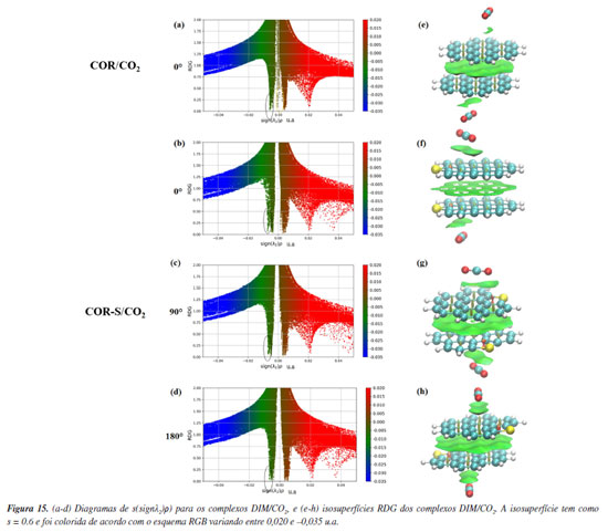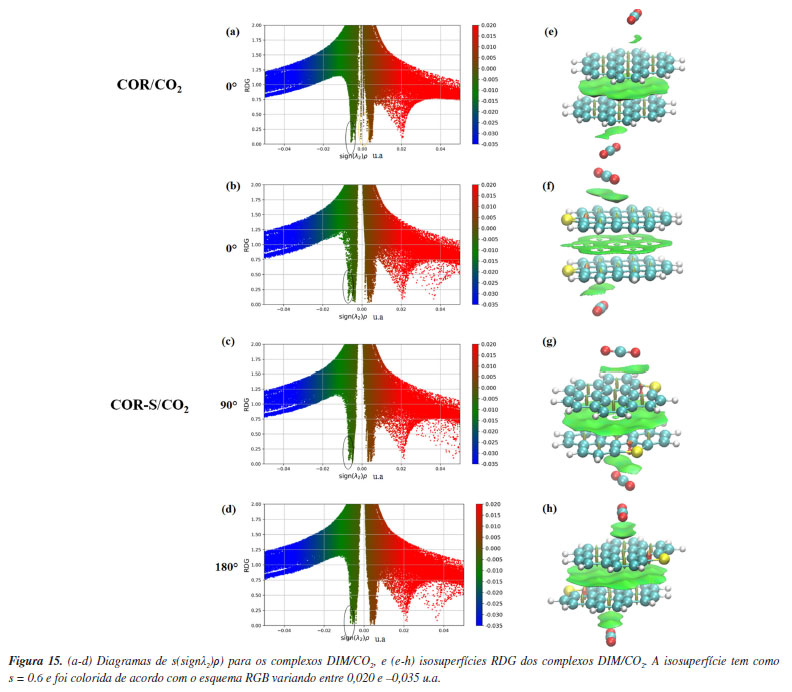 Essa variação pode influenciar no processo de desagregação realizada por um inibidor, pois o conhecimento destas características facilita uma remoção mais pontual da agregação, otimizando o trabalho numa linha de produção do óleo. Um dímero formado por estruturas negativas precisará de um inibidor com caráter ácido, assim como um dímero positivo precisará de um inibidor com caráter alcalino. No complexo do dímero COR/CO2 (Figura 14a), a magnitude das cargas parciais sobre os átomos de carbono muda quando comparado ao dímero de COR, sendo a ordem de grandeza das cargas maior (+0,757 ē) e mais positiva do que no dímero sem a influência do CO2 (+0,268 ē). Após adsorver no dímero de COR, o CO2 apresenta um aumento em sua carga parcial (carga no CO2 superior = - 0,016 ē e carga no CO2 inferior = - 0,026 ē) quando comparado a adsorção no monômero isolado (carga total = - 0,005 ē) e esse aumento é mais significativo na molécula mais próxima do dímero. Nos dímeros substituídos pelo átomo de enxofre, é possível observar a variação na magnitude das cargas dependendo da posição do heteroátomo, assim como nos dímeros sem a influência do CO2. Esta característica fica mais evidente na conformação θ = 0º (Figura 14b), onde na ausência do CO2, existia uma simetria entre as cargas parciais, e cada monômero apresentou a mesma distribuição de cargas, o que muda com a aproximação do CO2, que quebra esta simetria, criando um reordenamento das cargas parciais de acordo com a posição relativa do CO2. A carga do átomo de enxofre, que antes era igual, passa a ter valores distintos, qSsuperior = - 0,160 ē e qSinferior = - 0,143 ē e maiores do que no dímero sem a presença do CO2 (qS = - 0,128 ē), e quanto mais distante da molécula de CO2, mais negativa é a carga sobre o heteroátomo. A magnitude das cargas parciais muda quando comparado ao dímero sem CO2, sendo maior (+0,801 ē) e mais positiva. Após adsorver no dímero nesta conformação, o CO2 apresenta um aumento em sua carga parcial (carga no CO2 superior = - 0,053 ē e carga no CO2 inferior = - 0,051 ē) quando comparado a adsorção no monômero isolado (carga total = - 0,013 ē) e esse aumento é mais significativo na molécula mais distante do dímero. Na conformação θ = 90º (Figura 14c), a estrutura mais agregada dentre as substituídas, a magnitude das cargas parciais aumenta bastante quando comparado ao dímero sem CO2, sendo maior (+0,561 ē) e mais positiva do que no dímero sem a influência do CO2 (+0,486 ē). A carga do átomo de enxofre fica mais negativa em ambos os monômeros e passa a ter valores distintos, qSsuperior = - 0,473 ē e qSinferior = - 0,503 ē do que no dímero (qS = - 0,373 ē) e quanto mais distante da molécula de CO2, menos negativa é a carga do heteroátomo. Após adsorver no dímero nesta conformação, o CO2 apresenta diferentes variações em sua carga parcial (carga no CO2 superior = - 0,031 ē e carga no CO2 inferior = - 0,006 ē) quando comparado a adsorção no monômero isolado (carga total = - 0,013 ē) o aumento é mais significativo na molécula mais distante do dímero, visto que na mais próxima ocorre uma diminuição. Na conformação θ = 180º (Figura 14d), a magnitude das cargas parciais muda quando comparado ao dímero sem CO2, sendo maior (+0,797 ē) e mais positiva do que no dímero sem a influência do CO2 (+0,328 ē). A carga do átomo de enxofre aumenta (qSsuperior = - 0,130 contra - 0,099 ē e qSinferior = - 0,133 contra - 0,089 ē) e, quanto mais próxima da molécula de CO2, mais negativa é a carga do heteroátomo. Após adsorver no dímero nesta conformação, o CO2 apresenta um aumento em sua carga parcial (carga no CO2 = - 0,039 ē) quando comparado a adsorção no monômero isolado (carga total = - 0,013 ē) e é a mesma para ambas as moléculas de CO2. Os valores de todas as cargas encontradas estão diponíveis no material suplementar nas Tabelas 16S e 17S. A análise NCI expressa pelos gráficos em 2D do RDG (Figuras 15a-15d) mostra que a interação das moléculas de CO2 com os dímeros é de magnitude fraca, representada pelo pico verde na região de baixa densidade e corroborado pela pela presença da região verde entre a molécula e o monômero conforme os gráficos em 3D (Figuras 15e-15h). Além disso, a magnitude dessa interação diminui com a distância entre a molécula de CO2 e o dímero, pois quanto mais próximo do dímero, mais evidente e uniforme fica o gráfico de densidade entre as estruturas.