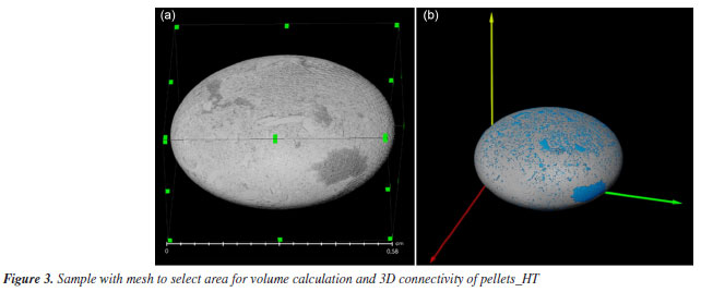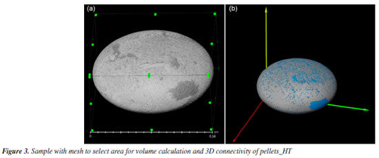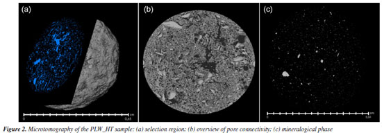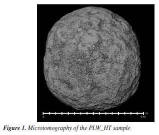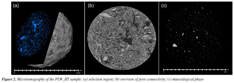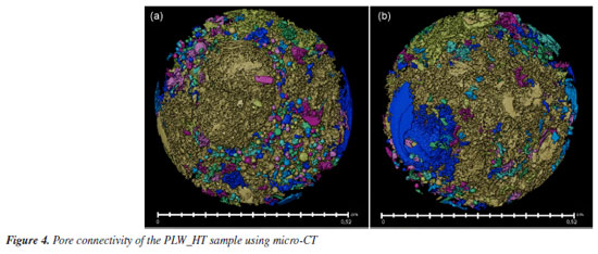 The microtomography treatment enables the visualization of the inherent pore connectivity within the samples, as demonstrated in Figures 4a and 4b for the PLW_HT sample.