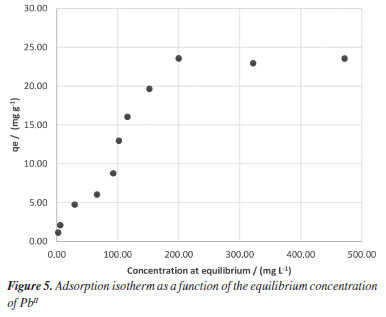 Based on the results analysis, it is observed that the correlation coefficients (R2) of the pseudo-second-order kinetic model for PbII are higher than those obtained with the pseudo-first-order model. The pseudo-second-order model exhibits superior correlation coefficients with the experimental data (R2 = 0.9993), indicating that this model provides a better description of the kinetics of the process. While the pseudo-first-order model also yields a reasonable R2 value, it results in an adsorption capacity value of 0.9687 mg g-1 of adsorbent at equilibrium. This value significantly deviates from the experimental qe value (2.73 mg g-1). In the case of data adjustment for the pseudo-second-order model, not only is the R2 value higher, but also the calculated value of qt (3.1162 mg g-1) is closer to the experimentally determined value (2.73 mg g-1). Additionally, the adsorption rate constant for the process is determined to be 0.0457 g mg-1 h-1. This model suggests that the adsorption rate depends on the quantity of ions on the surface of the adsorbent and the amount of ions adsorbed at equilibrium, taking into consideration the active sites of the adsorbent and the concentration of metal ions. Influence of metal ion concentration on the adsorptive process The initial concentration of metallic ions is a crucial variable influencing the performance and efficiency of the adsorption process. As noted by Demey et al.,30 increasing the concentration of the metal ion progressively enhances the removal of the metal until it reaches a saturation level. Modeling, in conjunction with the analysis of equilibrium data, enables the development of adsorption isotherms, which are pivotal in translating laboratory results into practical applications. These isotherms aid in comprehending process mechanisms, analyzing experimental data, predicting responses under operational conditions, and optimizing the process.31 Figure 5 depicts the adsorption isotherm of metallic cations, specifically PbII. On the ordinate axis, the quantities of the adsorbed ions per unit mass of the adsorbent (qe) are plotted, while the abscissa axis represents the concentration of PbII in solution after equilibrium (Ce). The experiments were conducted within an initial concentration range spanning from 30.9 to 1049.0 mg L-1 while maintaining the other parameters constant. The profile of this isotherm illustrates that the adsorption process for lead ions using the pellets is favorable for extracting relatively high amounts, even at low levels of adsorbate concentration in the fluid. Furthermore, it is evident that a plateau is formed, indicating an approach to equilibrium, consistent with the types of isotherms described by McCabe et al.32 It can be observed from Figure 5 that, for an initial metal ion concentration of 1049.00 mg L-1, the qe value obtained was 23.55 mg g-1 of PbII.
