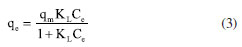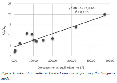 The adsorption isotherms can be categorized into four groups based on the shape of the curve. From the graph presented in Figure 5, it can be inferred that the isotherm obtained for the palygorskite pellets in the PbII adsorption process falls within class L and subgroup 4.33 Isotherms in this class suggest that as more solid sites are occupied during the process, it becomes increasingly challenging for other solute molecules to occupy vacant sites, leading to the initial downward curvature. Furthermore, it indicates that molecules are adsorbed in layers, which is characteristic of subgroup 4. This suggests that adsorption occurs in a horizontal manner with limited competition from the solvent for surface sites. In this context, numerous models have been developed to describe isotherms, and they have proven to be successful in explaining the sorption mechanism.34 Despite being empirical models with straightforward mathematical relationships, typically characterized by the number of adjustable parameters, they generally offer a sound representation of experimental behavior across a broad range of operating conditions.31,35 Langmuir isotherm The Langmuir isotherm is based on three key assumptions: first, that sorption is limited to monolayer coverage; second, that all surface sites are identical and can only accommodate one adsorbed atom; and third, that the ability of a molecule to be adsorbed at a given location is independent of its occupation. According to the Langmuir model, the saturation capacity (qmax) must correspond to the saturation of a fixed number of identical surface sites, representing the equilibrium distribution of metal ions between the solid and liquid phases. This model assumes uniform adsorption energies at the surface and no transmigration of the adsorbate in the surface plane.21 Fittings of lead adsorption data to the linearized equation of the Langmuir model are shown in Figure 6.