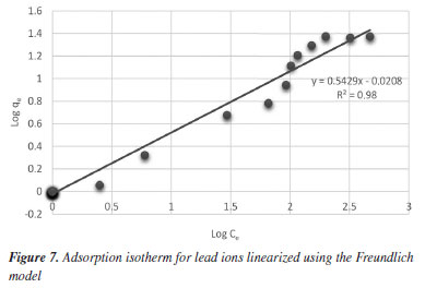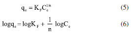 Based on the data fitting, the maximum adsorption value (qm) was determined to be 31.84 mg g-1, with a value of b equal to 0.0070 and an R2 of 0.8095. In a similar data fitting conducted by Simões et al.,14 using processed palygorskite, the Langmuir model achieved an R2 of 0.9943. It is worth noting that in the study conducted by Potgieter et al.11 on lead ion adsorption, it was reported that the adsorption profile of palygorskite is well described by the Langmuir equation. Freundlich isotherm Developed with the primary objective of empirically studying the adsorption of gases on solid surfaces,36 the Freundlich model, similar to the Langmuir model, has found extensive application in describing the adsorption of metal ions using various adsorbents. Primarily employed to characterize adsorption on heterogeneous surfaces,37 this model assumes that sites with higher binding affinities are occupied first.38 Fitments of lead adsorption data to the linearized equation of the Freundlich model are presented in Figure 7.