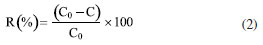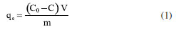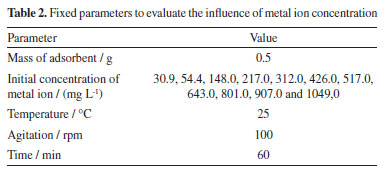 Adsorption tests The adsorption efficiency of the produced pellets was assessed through batch experiments using a lead(II) nitrate (Pb(NO3)2) solution. These experiments involved utilizing 0.5 g of pellets and 20 mL of the lead solution, with a contact time of 1 h. To facilitate contact between the pellets and the effluent, agitation was carried out using an orbital shaking table, model KS 4000i, (IKA, Guangzhou, China), with a rotation speed of 100 revolutions per minute (rpm) at room temperature. The tests were conducted in duplicate to ensure reliability, and the quantification of lead ions after adsorption was performed using atomic absorption spectroscopy. Quantification of Pb2+ ions The analytical method employed for determining the total concentration of Pb2+ ions dissolved in synthetic effluent was inductively coupled plasma optical emission spectrometry (ICP-OES). The analyses were conducted using equipment from Horiba Jobin Yvon (Longjumeau, France). To study the lead adsorption isotherm and comprehend the relationship between the effluent concentration and the quantity of Pb2+ ions adsorbed, the adsorption capacity (qe) and removal percentage (R%) of palygorskite pellets at equilibrium were calculated using the Equations 1 and 2: ![]() where: qe is the adsorption capacity, C0 is the initial concentration of Pb2+ ions in the effluent, Ce is the equilibrium concentration of Pb2+ ions in the effluent, V is the volume of the effluent, m is the mass of palygorskite pellets used. ![]() where: R% is the removal percentage, C0 is the initial concentration of Pb2+ ions in the effluent, Ce is the equilibrium concentration of Pb2+ ions in the effluent. These equations allow you to determine the adsorption capacity and the percentage of lead ions removed by the palygorskite pellets in equilibrium with the effluent. Influence of contact time To investigate the influence of contact time on the adsorption process of lead ions in batch experiments, samples were analyzed at various time intervals, specifically: 15, 30, 45, 60, 75, 90, and 120 min. The initial concentration of the Pb(NO3)2 solution was set at 77.3 mg L-1, and the experimental parameters remained consistent with those described in the preliminary test mentioned in the previous topic. This analysis helps in understanding how the adsorption of lead ions by the palygorskite pellets evolves over time. Influence of metal ion concentration The influence of the concentration of lead(II) metal ions was investigated as it plays a crucial role in the adsorption rate. This variable is of paramount importance for understanding the adsorption process, as it is typically used to determine the maximum adsorption capacity of the metal ion by the chosen adsorbent. Table 2 presents the experimental conditions employed during the study. Following the completion of the test, the solution was subjected to atomic absorption analysis to quantify the concentration of PbII ions.