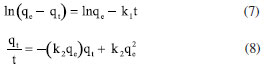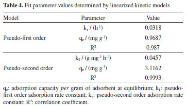 Note in the images that several clusters are forming through interconnected pores. Each color in the cluster identifies pores that are connected to each other but not to clusters of a different color. Therefore, it can be concluded that these pellets exhibit well-connected pore spaces. It is worth highlighting the presence of spheres in the PLW_HT sample (Figure 4a). These spheres may be attributed to the agglomeration of particles that compose the pellets, facilitated by the action of binders, resulting in the formation of smaller spheres within the material. Adsorption of lead ions in batch process Influence of time on the adsorptive process Kinetic parameters play a crucial role in sorption processes as they help predict the adsorption rate and provide essential information for process modeling. Consequently, the kinetics of adsorption for the removal of PbII was examined and interpreted using pseudo-first-order and pseudo-second-order kinetic models.29 Based on the results obtained in the adsorption study, it is clear that contact time plays a significant role in the process efficiency. Remarkably, within just 15 min, there was a removal of approximately 73% of lead(II) ions from the solution. Subsequently, after 90 min, the adsorption percentage remained nearly constant, indicating the equilibrium point for the process. Between 75 and 120 min, the highest adsorption percentage, approximately 96%, was observed, albeit with some pellets undergoing disaggregation during this period. This led to an increase in surface area and consequently enhanced removal efficiency in the adsorption process. Hence, we selected a 60 min duration, where the removal percentage was 88.36%, as the equilibrium time for the adsorption process in this study, indicating the saturation of the pellets (the adsorbent material used). The rapid attainment of adsorption equilibrium indicates that the adsorbent surface is readily available for adsorption. Consequently, the observed effect of contact time suggests a significant increase in adsorption within the initial minutes of contact between the adsorbent and the metal ion. Similar trends have been reported in the literature.11,14 For instance, Potgieter et al.11 conducted a study on the effect of time for the removal of PbII using powdered palygorskite as an adsorbent and concluded that equilibrium is reached rapidly, typically within just 30 min. This finding further supports the notion that the adsorption sites are well-exposed and readily accessible. According to a study conducted by Simões,14 in 2023, where the equilibrium time was exclusively examined using powdered palygorskite for the removal of lead(II) ions, it was observed that there was no significant variation in the percentage of adsorption within the time interval ranging from 10 to 360 min. Considering that the palygorskite used in this current work has also been enhanced and that the surface area of the powdered sample is notably higher compared to the pellet samples, it was anticipated that there might be a reduction in the percentage of adsorption when using pellets, in line with the observations made. Considering that powdered palygorskite is an excellent adsorptive material, known for its high metal ion removal efficiency, it faces a limitation in direct application due to its fine granularity. However, the results obtained from adsorption using pellets made from this material are promising. This opens up the possibility of applying the material in adsorption columns. Utilizing a fixed bed column for adsorption offers several advantages, including the ability to carry out the process continuously without interruptions until the adsorbent becomes saturated. Additionally, to enhance the efficiency of the process, it is feasible to use the pellets as adsorbents in series columns. Kinetic data were analyzed using two kinetic models: pseudo-first order and pseudo-second order. The kinetic models were linearized using Equations 7 and 8, respectively. ![]() where: qe (mg g-1) is the adsorption capacity per gram of adsorbent at equilibrium; qt (mg g-1) is the adsorption capacity per gram of adsorbent at time t; t (h) is the contact time; k1 (h-1) is the pseudo-first order adsorption rate constant; k2 (g mg-1 h-1) is the pseudo-second order adsorption rate constant. The values obtained for the adsorption capacity at equilibrium, as well as the adsorption rate constant and the correlation coefficient (R2) for each of the linearized models are presented in Table 4.