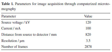 Figure 2a clearly shows that the entire selected region is contained within the sample. In Figure 2b, it is evident that the connectivity of the pores is higher than what was observed in the scanning electron microscopy analysis. Additionally, it is apparent that the pores exhibit irregular shapes, and the images reveal the presence of various mineralogical phases within the sample. Notably, minerals with higher attenuation correspond to the white color in the image (Figure 2c), while quartz exhibits an intermediate gray coloration, and the pores are depicted in black.