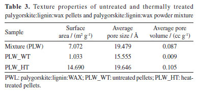 EXPERIMENTAL Materials, binder and mixture preparation The raw palygorskite was obtained in Guadalupe, Piauí, Brazil, and its preparation was carried out as previously described by Simões et al.18 In this study, palygorskite with a particle size below 20 μm was utilized. The lignin sample (Klabin, Rio de Janeiro, Brazil) underwent a washing process in a vacuum filtration system and was subsequently dried in an oven at 40 ºC for 30 h. It was then subjected to a grinding step using a basic analytical mill A11 (IKA, Guangzhou, China). Micropulverized C-wax supplied by Merck (Darmstadt, Germany) and also known as WAX® binder, has the molecular formula C38H76N2O2 and molar mass of 593.03 g mol-1. This binder did not require any prior treatment for use in the pelletizing process. Palygorskite pellets: preparation and characterization Palygorskite with a particle size below 20 μm was used for pelletization, employing both lignin and WAX® as binders. Tests were conducted with varying amounts (% m/m) of lignin and WAX® relative to the quantity of palygorskite. The systems created had the following compositions: 70:15:15, 80:10:10, and 60:20:20, denoting palygorskite:lignin:WAX® ratios. These mixtures were divided into quarters using a rotary fines splitter, model QRF-2 (CDC, São Paulo, Brazil), and subsequently further subdivided with a Rotary Micro Riffler sample (Quantachrome, Florida, USA). The pellets were manufactured using a MSI Motor model SKR 63L (Madison Heights, USA) pelletizing disk equipped with a hard disk measuring 35 cm in diameter. The pelletizing procedure for palygorskite followed the method described by Campos and Fonseca,17 with adjustments as described by Furlanetto.19 These adaptations were necessary since the original procedures were designed for iron ore fines. During this process, sieves were employed to separate pellets of specific sizes, with smaller pellets being introduced into the disc feed to increase the overall mass. The following sieves were used: 6.35, 5.60, 4.75, 3.36, 2.80, and 1.68 mm in opening size, and the chosen size range fell between greater than 3.36 mm and less than 4.75 mm. Following this procedure, the pellets were spread out on trays and allowed to dry for 24 h at room temperature. Subsequently, they were placed in an oven at a temperature of approximately 60 ºC for further drying. Heat treatment The heat treatment of the pellets was conducted in a muffle furnace, model LF0061201 (Jung, Florida, USA). Pellets falling within the size range of 2.80 to 4.75 mm were carefully chosen, and approximately 3 to 4 g of these pellets were weighed and placed into small porcelain boats. These boats were then introduced into the muffle furnace and exposed to temperatures of 100, 200, and 300 ºC for varying durations of 30, 60, and 90 min. Subsequently, the heat-treated pellets, denoted as PLW_HT, underwent characterization using a range of techniques, including X-ray diffraction (XRD), N2 physisorption, scanning electron microscopy (SEM), Zeta potential analysis, contact angle and computed microtomography. X-Ray diffraction (XRD) XRD patterns of the samples were obtained using the powder method with a Bruker D4 Endeavor equipment (Massachusetts, USA). The X-ray source used was Co Kα radiation at 35 kV/40 mA. The goniometer operated at a velocity of 0.02º (2θ) per step with a 1 s collection time per step, and data were collected in the range of 5 to 80º (2θ). To qualitatively interpret the obtained spectra, a comparison was made with standards available in the PDF02 database (ICDD 2006), and this analysis was performed using the Bruker AXS software DiffracPlus (Massachusetts, USA). Textural properties The textural properties of the mixture composed of palygorskite, lignin, and WAX®, as well as the untreated pellets (PLW_WT) and heat-treated pellets (PLW_HT), were determined through nitrogen (N2) physisorption analysis conducted at - 196 ºC (77 K). These analyses were carried out using a Micrometrics instrument (Georgia, USA), with approximately 400 mg of each sample. Prior to the actual analysis, a pretreatment step was performed on the samples. This pretreatment involved drying the samples at 100 ºC under a vacuum of 1 × 10-6 mmHg for 24 h to eliminate physically adsorbed water. Following the pretreatment, the analysis involved obtaining adsorption and desorption isotherms by varying the partial pressure of N2. From these isotherms, the surface area was calculated using the BET (Brunauer, Emmett and Teller) method, and the pore size distribution was determined from the desorption isotherm of N2 using the BJH (Barret-Joyner-Halenda) method. Scanning electron microscopy (SEM) Scanning electron microscopy analysis was conducted using a Hitachi TM303 Plus microscope (Tokyo, Japan) equipped with modules for secondary electrons, backscattered electrons, and energy dispersive X-ray spectrometry (EDS). This analysis aimed to qualitatively determine the chemical elements present in the samples. To prepare the samples for SEM analysis, they were metallized with silver using the Bal-Tec-SCD005 Sputter Coater equipment (Uzwil, Switzerland). Metallization with silver is a common technique used in SEM to enhance the conductivity of non-conductive samples and improve image quality during analysis. Zeta potential The Zeta potential, which represents the surface charge of lignin, was determined using the Zetasizer Nano ZS equipment (Malvern, United Kingdom). To perform the measurements, 0.5 g of sample solutions were prepared in 10 mL of KCl with a concentration of 10-3 mol L-1, serving as the electrolyte. For pH adjustment in the range of 1.5 to 11.0, HCl or KOH solutions were used, and this adjustment process was facilitated by employing a potentiometric titrator coupled to the system. Contact angle The procedure was conducted after calibrating the MSA One-Click SFE mobile surface analyzer (Krüss, Hamburg, Germany), using an acrylic surface. Duplicate mea