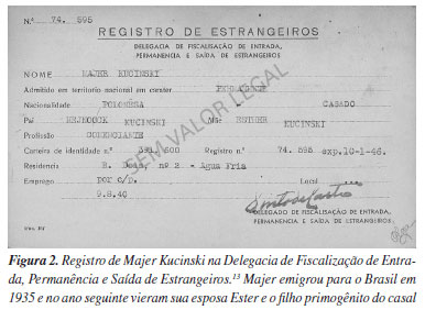 A OPÇÃO PELA QUÍMICA Filha de imigrantes poloneses (Majer e Ester Kucinski), Ana Rosa nasceu em São Paulo em 12 de janeiro de 1942, assim como seu irmão Bernardo alguns anos antes (1937). A história da família, desde antes da chegada ao Brasil, foi detalhadamente contada no livro Kaddish - Prece por uma Desaparecida9 e foge ao escopo deste texto, mas Majer emigrou para o Brasil em 1935 (Figura 2) e Ester veio um ano depois, trazendo Wulf, o filho primogênito do casal nascido na Polônia em 1932.12
