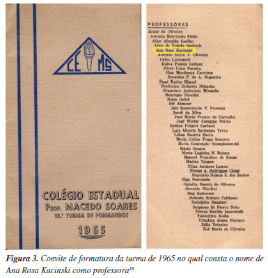 O CURSO DE QUÍMICA Os depoimentos de todos os que conviveram mais diretamente com Ana Rosa no então Departamento de Química da FFCL da USP e depois no IQ a descrevem como uma pessoa sensível e sociável, além de muito culta, compartilhando seu gosto refinado na música, literatura, poesia, cinema e teatro com amigos. Era também uma pessoa extremamente franca, direta, que não suportava alienação e era avessa ao conservadorismo. É fácil compreender que no ambiente acadêmico austero do IQ (e, infelizmente, da própria Universidade) não foram poucos os que não se afinaram com seu modo de ser, com sua visão de mundo e com a postura crítica para com a política nacional então autoritária e persecutória. No início da década de 1960, ainda não havia o campus do Butantã e as disciplinas eram ministradas em lugares diferentes: as aulas experimentais de química aconteciam na Alameda Glete, as aulas de matemática na Faculdade de Filosofia situada à Rua Maria Antônia e as de física eram ministradas nos novos laboratórios do Departamento de Física, que já em 1965 eram na Cidade Universitária.15 Apenas em 1966, todas as disciplinas passaram a ser ministradas no campus do Butantã.16 Seu desempenho no primeiro ano de graduação foi péssimo e apenas logrou aprovação na disciplina Complementos de Matemática. Naquele ano (1961), sua mãe fora diagnosticada com um câncer de mama agressivo e era cuidada apenas por Ana Rosa, o que provavelmente explica seu desempenho inexpressivo nas disciplinas. Infelizmente sua mãe veio a falecer em janeiro de 1962 e, a partir desse ano, seu histórico escolar registra apenas aprovações em todas as disciplinas cursadas, confirmando o impacto do drama vivido por sua família em seu primeiro ano de Universidade. Concluiu o bacharelado e a licenciatura em Química em 1965 e, dentre os formandos daquele ano, estão colegas que também fariam carreira acadêmica no que viria a ser chamado de Instituto de Química como formalizado na ata da Congregação de 27 de fevereiro de 1970, entre eles, Jaim Lichtig, Miuaco Kawashita, Paulo Roberto Olivato, Roberto Casadei de Baptista, Rogério Meneghini e Sérgio Massaro. Até sua formatura, Ana Rosa lecionou Química no Colégio Caetano de Campos17 e no Colégio Estadual Prof. Macedo Soares18 (Figura 3). Esse era e ainda hoje é o principal recurso que os estudantes de cursos de período integral usam para se manterem financeiramente. Tempos depois, um dos colegas de Ana Rosa no Colégio Estadual Prof. Macedo Soares ganharia notoriedade no ensino de matemática: Scipione Di Pierro Netto, falecido em 2005.
