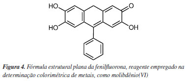 O INÍCIO DA PÓS-GRADUAÇÃO Ana Rosa iniciou a pós-graduação em 1966, logo após sua formatura, e desde então foi bolsista FAPESP (processos No. 66/051, 68/082 e 69/082). O Conselho Nacional de Pesquisa (CNPq) é citado nos Agradecimentos de sua Tese, mas não foi possível saber se seria por bolsa de estudos ou por auxílio financeiro ao projeto; tampouco foram encontrados registros de quando isso teria acontecido. Nos anos de 1967 e 1968, Ana trabalhou como Bolsista de Ensino20 uma condição que permitia a alunos que ainda não tinham mestrado ou doutorado auxiliarem em disciplinas experimentais. A partir da implantação da reforma universitária em 1970 houve uma expansão significativa no número de alunos das turmas, devido ao aumento no número de ingressantes e isso causou visível desconforto em Ana Rosa, com as dificuldades impostas pelas novas demandas das disciplinas.21 Em sua Tese de Doutorado, ela investigou a separação e quantificação de molibdênio(VI) em misturas com tungstênio(VI). Usou métodos de extração do metal com solventes orgânicos em meio ácido e desenvolveu um método colorimétrico para sua quantificação. Molibdênio é considerado um material estratégico pelo uso, por exemplo, em dispositivos eletrônicos e em ligas metálicas com propriedades específicas. Em tais aplicações é necessário que o metal tenha alta pureza, entretanto, molibdênio (Mo) e tungstênio (W) comumente se encontram presentes em minérios e a preocupação em separá-los já existia desde o final do século 19.22 A dificuldade reside no fato desses metais possuirem propriedades químicas bastante semelhantes, tornando sua separação e purificação verdadeiros desafios. Atualmente, a exaustão de minas nas quais W era encontrado em alta pureza, ainda traz a questão da separação e purificação desses metais, seja de minérios impuros seja de rejeitos de produção e de catalisadores. Isso explica por que desde 1971 tenham sido publicados cerca de 23 artigos por ano sobre esse tema. A Tese de Doutorado de Ana Rosa, dedicada ao pai, foi defendida em fevereiro de 1973 e tem por título "Estudo sobre a Extração de Molibdênio(VI) em Solventes Orgânicos e sua Aplicação Analítica".23 A pesquisa da eficácia da extração de molibdênio(VI) em soluções clorídricas em grande número de solventes orgânicos testados revelou extração quantitativa do metal por espectrofotometria quando complexado por fenilfluorona (2,3,7-trihidroxi-9-fenil-6-fluorona, Figura 4). Esse reagente orgânico foi empregado na década de 1940 para a detecção colorimétrica de germânio24 e, posteriormente, de outros metais, como o zircônio.25 O método se mostrou seletivo para a maioria dos interferentes, inclusive tungstênio, neste caso empregando ácido cítrico. O limite inferior de detecção utilizando o método colorimétrico proposto foi de 0,1 µg de molibdênio(VI) mL-1.
