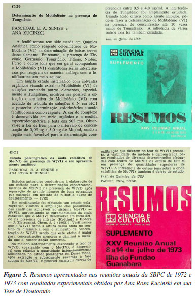 O desaparecimento de Ana Rosa no ano seguinte à defesa de sua Tese certamente foi determinante para que os resultados obtidos nunca fossem publicados, exceto em duas reuniões da Sociedade Brasileira para o Progresso da Ciência (SBPC). Parte dos resultados foi apresentada na 24ª Reunião Anual da SBPC (1972), realizada em São Paulo ("Determinação de Molibdênio em Presença de Tungstênio")26 e na 25ª Reunião Anual da SBPC que aconteceu no ano seguinte no Rio de Janeiro ("Estudo Polarográfico da Onda Catalítica de Mo(VI) em Presença de W(VI) e seu Aproveitamento Analítico"),27 ambos em coautoria com seu orientador Prof. Paschoal Senise (Figura 5).