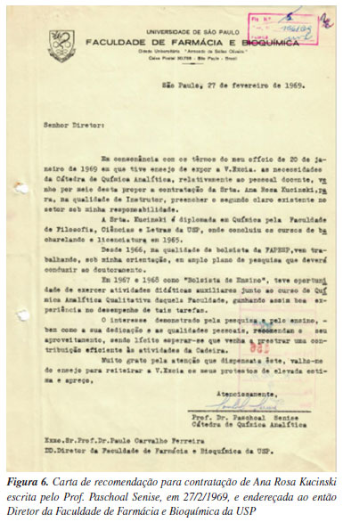 CONTRATAÇÃO COMO DOCENTE No final dos anos 1960, a contratação de docentes se fazia por indicação de professores catedráticos e assim foi com Ana Rosa. Indicada por seu orientador (Prof. Paschoal Senise), a carta de recomendação destaca algumas de suas características: "O interesse demonstrado pela pesquisa e pelo ensino, bem como a sua dedicação e as qualidades pessoais, recomendam o seu aproveitamento, sendo lícito esperar-se que venha a prestar uma contribuição eficiente às atividades da Cadeira" (Figura 6).