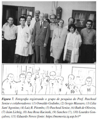 Ana Rosa foi, dessa forma, contratada em 13/5/1969 (RUSP 7.701/69) inicialmente como Instrutora de Ensino junto à Cadeira de Química Analítica em Regime de Tempo Parcial (RTP) por 730 dias, a pedido da então Faculdade de Farmácia e Bioquímica da USP. Este regime foi alterado em 16/10/1969 para RDIDP (Regime de Dedicação Integral à Docência e à Pesquisa) e, sequencialmente prorrogado até 31/12/1974. Em fevereiro de 1970, Ana foi realocada para o Instituto de Química, criado naquele ano pela Reforma Universitária. No início de 1972, a função de Instrutora passou a se chamar Auxiliar de Ensino e, a partir da defesa de seu doutorado (em 23/2/1973), assumiu a função de Professora Assistente Doutora.2 Na Figura 7, Ana Rosa aparece com os demais membros do grupo de pesquisa do Prof. Senise, junto de alguns de seus amigos mais próximos: Lourdes Gonçalves, Sérgio Massaro e Jaim Lichtig.